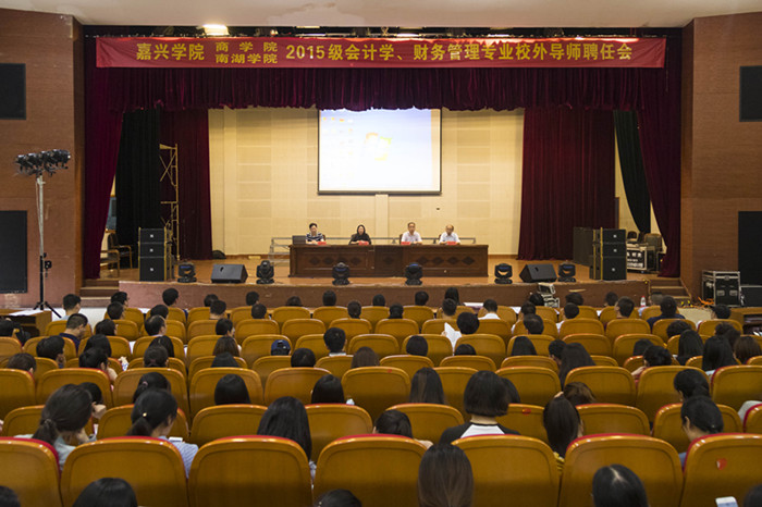 5月31日下午,pg麻将胡了2 、南湖pg麻将胡了2 在第二教学楼报告厅联合召开了2015级会计学、财务管理两个专业共14个班级学生的“双导师制”聘任见面会。校教务处相关领导,pg麻将胡了2 、南湖pg麻将胡了2 领导及来自嘉兴市内各企事业单位财会实务界的125名校外导师、会计和财务管理专业的全体专业教师和2015级全体学生参加了大会。会议由pg麻将胡了2 副院长李郁明主持。