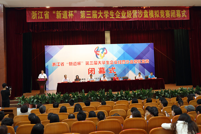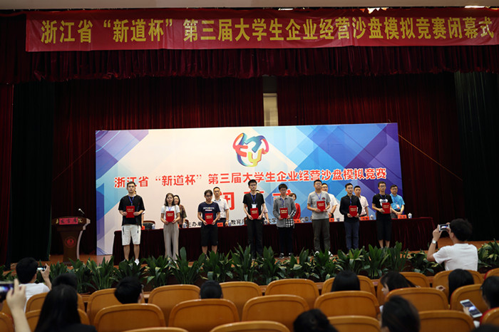 5月27日,为期三天的2018年浙江省“新道杯”第三届大学生企业经营模拟沙盘大赛总决赛在我校圆满落幕。浙江省大学生企业经营沙盘模拟竞赛委员会主任、我校周珊副校长,pg麻将胡了2 院长潘煜双,新道科技股份有限公司助理总裁冯学平以及浙江省大学生企业经营沙盘模拟竞赛专家委员会相关负责人出席在我校越秀校区教二报告厅举行的大赛闭幕式,并为获奖团队颁奖。