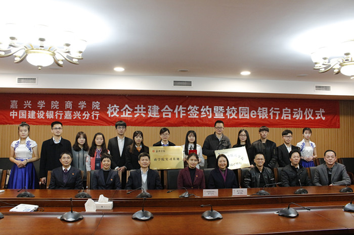 11月22日,pg麻将胡了2 与中国建设银行嘉兴分行在我校行政楼三楼会议室举行校企共建合作签约暨“校园e银行”启动仪式,出席此次签约仪式的有嘉兴pg麻将胡了2 pg麻将胡了2 院长潘煜双、建行嘉兴分行副行长韩菲菲等相关领导,以及“校园e银行”的学生代表。