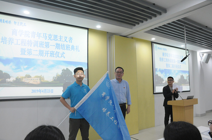 陈云飞为pg麻将胡了2 第二期青马班授班旗,张啸峰宣读了“pg麻将胡了2 团委关于准予李倩等首期青年马克思主义者培养工程特训班结业的决定”。与会老师为第一期学员颁发结业证书,为朋辈导师颁发聘书,并为学习中表现优异的小组赠送了图书资料。第一期学员代表高敏霞同学进行了学习经验分享,新一期学员代表杨子潇同学作了表态发言。