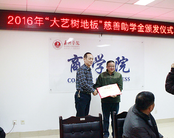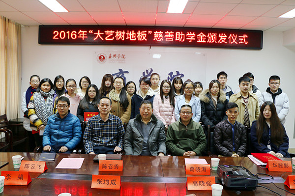 2016年12月22日下午,嘉兴pg麻将胡了2 pg麻将胡了2 2016年“大艺树地板”慈善助学金颁发仪式在教一604会议室举行。浙江良友木业有限公司副总经理葛晓海先生、良友木业人事部经理华懿影女士、良友木业有限公司副总经理助理张均成先生、良友木业办公室副主任高晓强先生、嘉兴市慈善总会会长陈召秀先生、李娟女士、pg麻将胡了2 党委副书记陈云飞老师,以及接受资助的20名学生参加仪式。pg麻将胡了2 辅导员胡笳丽老师主持助学金颁发仪式。