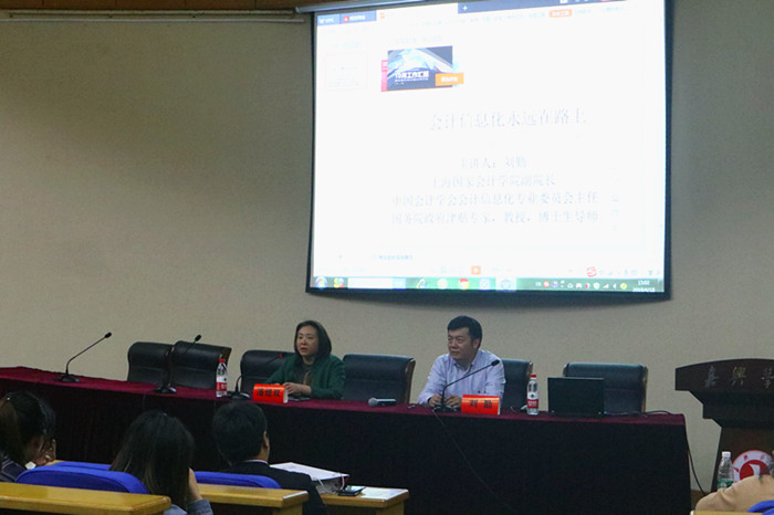 讲座上,刘勤教授从财务变革的动因和内容、会计信息化的发展方向、对未来变革的思考等三方面深入浅出的阐释了人工智能与大数据对企业财务工作的影响。他指出,经济全球化、科技革命、管理变革是企业转型乃至企业财务转型的重要动因,结合当前企业对具有国际化视野的优秀财会人员“质”和“量”的要求,今后财会从业人员必将由传统意义上的“账房先生”向“军师参谋”进行转型,财会从业人员的工作格局也必将是一种人机协同共生的发展模式。他希望,会计专业同学务必明确新的财务变革不可阻挡,务必需要时刻关注会计信息化发展趋势,务必严格要求自己不断更新知识结构。