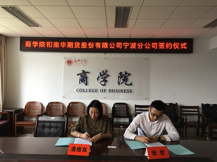 6月14日下午,pg麻将胡了2 与南华期货股份有限公司宁波分公司举行校企合作签约仪式。南华期货股份有限公司宁波分公司总经理张哲、嘉兴营业部总经理王一峰、桐乡营业部总经理叶坚一行与pg麻将胡了2 院长潘煜双、副院长袁顺波等出席签约仪式。