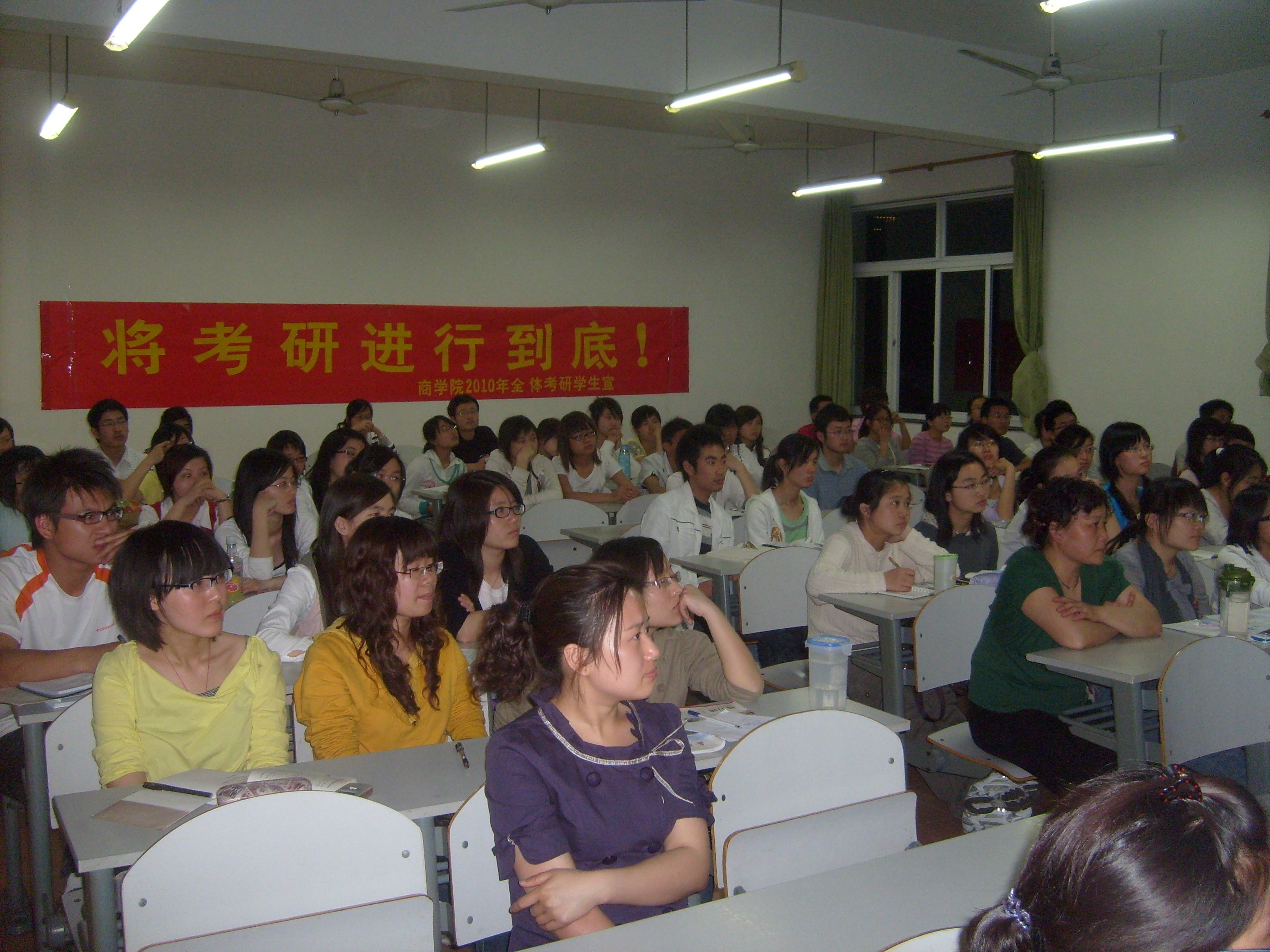 交流会的第二阶段由pg麻将胡了2 负责就业的 杨行翀 老师介绍了近两年pg麻将胡了2(中国)官方网站 的考研情况,最后是四位2009年成功考研同学向大家讲述自己的考研经历和经验。整个交流会持续了两个多小时,在交流会结束后,同学们还在“将考研进行到底”的横幅上签上了自己的名字,承诺将2010年考研进行到底,直到取得胜利。