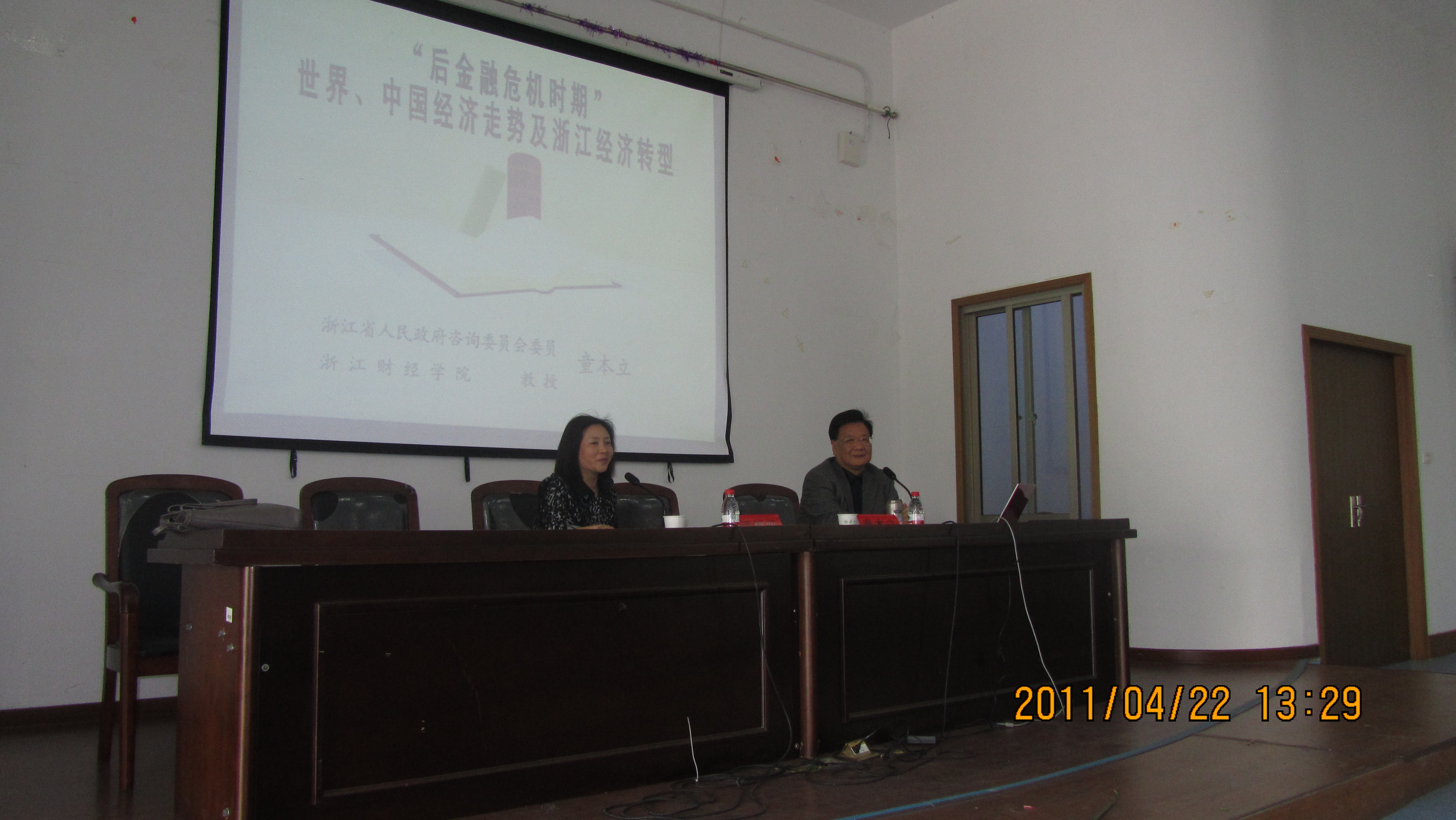 报告会上,童教授以丰富的案例、风趣幽默的语言,深入浅出地从 “后金融危机时期的主要特征、国际金融危机对中国的启示,2011年世界经济形势分析、2011年中国经济形势分析、加快浙江经济转型升级”五个方面分析了后金融危机时期中国面临的机会和挑战,国内外的经济走势,并在此基础上分析提出浙江经济以转型促发展的对策建议。
