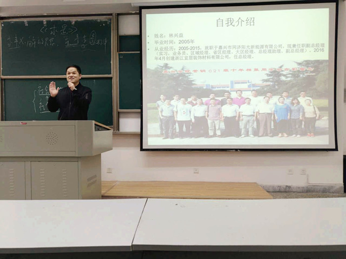 3月29日,市场营销专业第二场“校外导师讲坛”开讲,校外导师林兴益先生受邀前来授课。林兴益是我校市场营销专业2005届校友,现任嘉兴市同济阳光新能源有限公司副总经理,并受聘为pg麻将胡了2(中国)官方网站 市场营销专业试验区首批校外导师。 林兴益和同学们分享了自己从一个实习生到如今的总经理所经历的人和事,从一开始的职场菜鸟到如今的有所作为整个过程中的人生感悟。林兴益告诉同学们,坚持很重要,要热爱自己的工作并为之不懈努力;要心无旁骛专心业务,不八卦、不是非;要合理处理公司人际关系,维护好上下级关系。林兴益生动丰富的实战经验,绘声绘色、充满睿智的讲解与风趣的谈吐博让同学们获益匪浅,得了同学们的阵阵掌声。 在随后的交流环节,林兴益还耐心解答了同学们在校学习的困惑,和同学们围绕如何做好职业经理人、如何做好实习、营销职业人才应具备哪些素质等话题进行了富有成效的交流。
