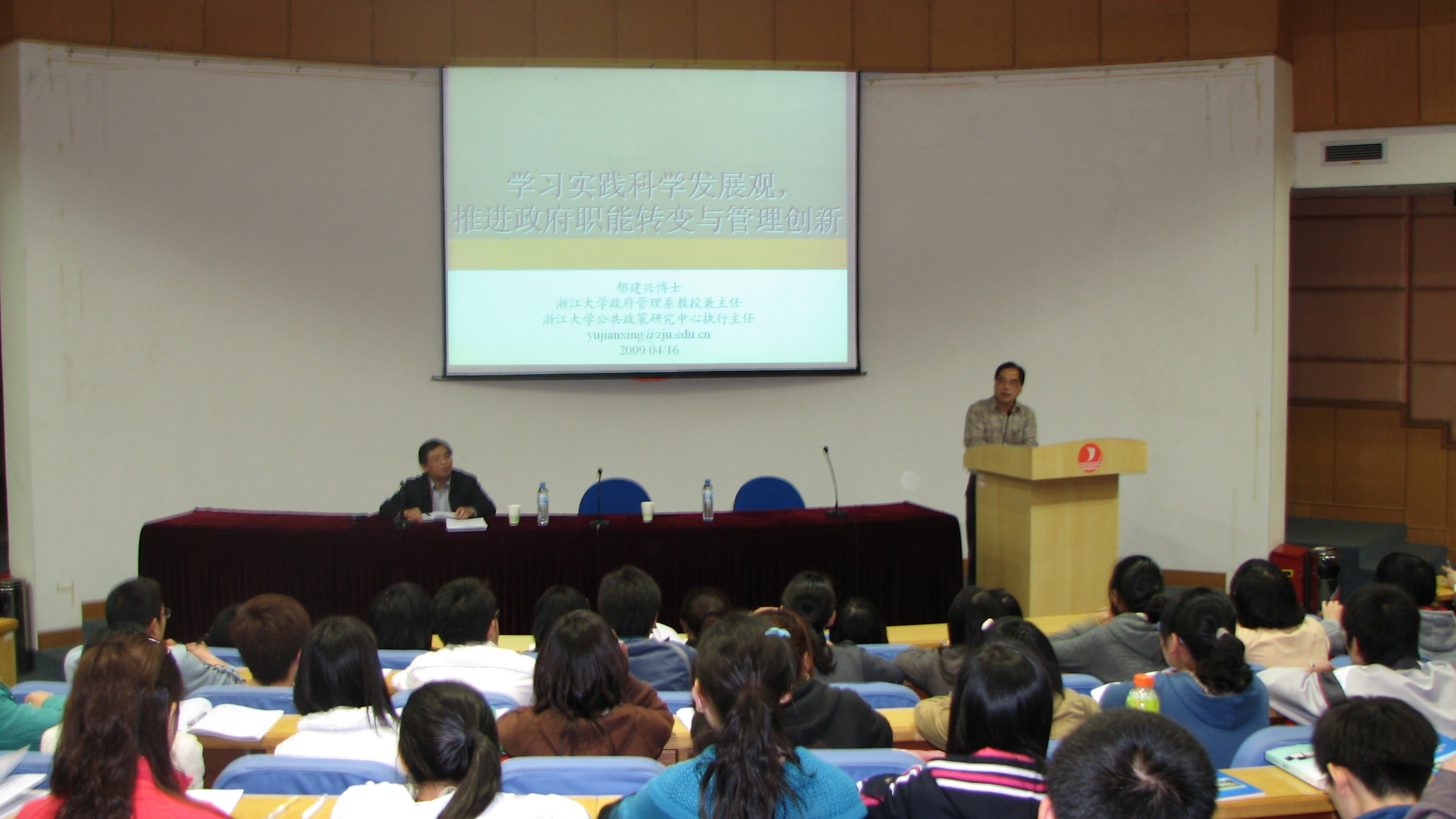 2009年4月16日晚,由pg麻将胡了2 主办,浙江大学公共管理pg麻将胡了2 博导、浙江大学公共政策研究中心执行主任、浙江省公共管理学会副会长郁建兴教授主讲的“学习实践科学发展观,推进政府职能转变与管理创新”学术报告在行政楼一楼报告厅举行。