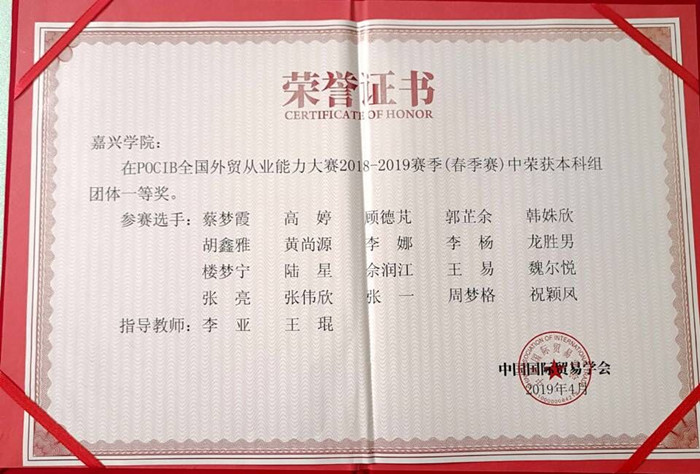 该比赛既是团体赛,也是个人赛,需要团队中20位选手在20天赛程中在线仿真操作完成400笔进出口交易。本届POCIB大赛共有179所院校、237支队伍、共计4740名选手参加。在长达20天马拉松式的赛程中,我校赛队共完成400笔进出口业务,缮制各类业务单据约5000余张,撰写业务函电约4000封。大赛不仅提升了参赛选手的多项外经贸专业综合技能,更是培养了团队合作精神、外经贸职业素养和积极向上、努力奋斗的拼搏精神。同时充分体现了我校《国际贸易实务》示范课程建设的育人成果,和我校国际经济与贸易专业实践教学改革的显著成效。