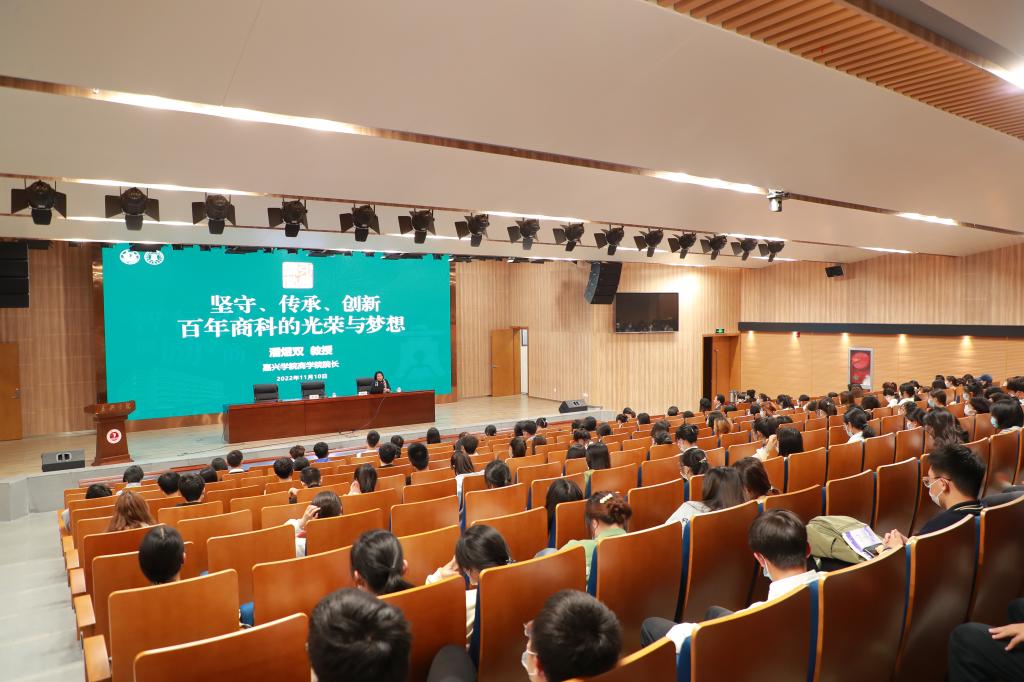 11月10日下午,pg麻将胡了2 “弘商讲堂”在图书馆报告厅开讲。pg麻将胡了2 院长潘煜双教授作题为《坚守、传承、创新:百年商科的光荣与梦想》的首场讲座。pg麻将胡了2 党委书记邵燕主持,副院长李郁明、教师代表以及200余名学生到会聆听报告。