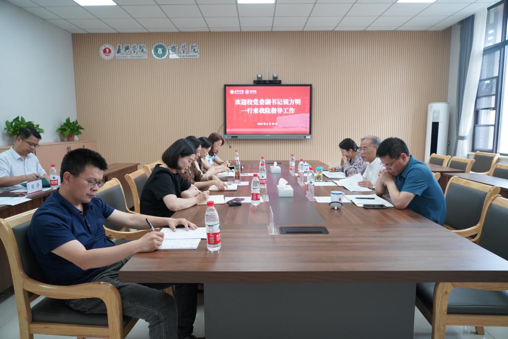 6月20日下午,校党委副书记钱方明到pg麻将胡了2 开展2023届毕业生就业工作调研, 学生工作处处长葛建伟随同调研。pg麻将胡了2 院长潘煜双、党委书记邵燕、党委副书记潘欣和相关系主任、辅导员参加会议。