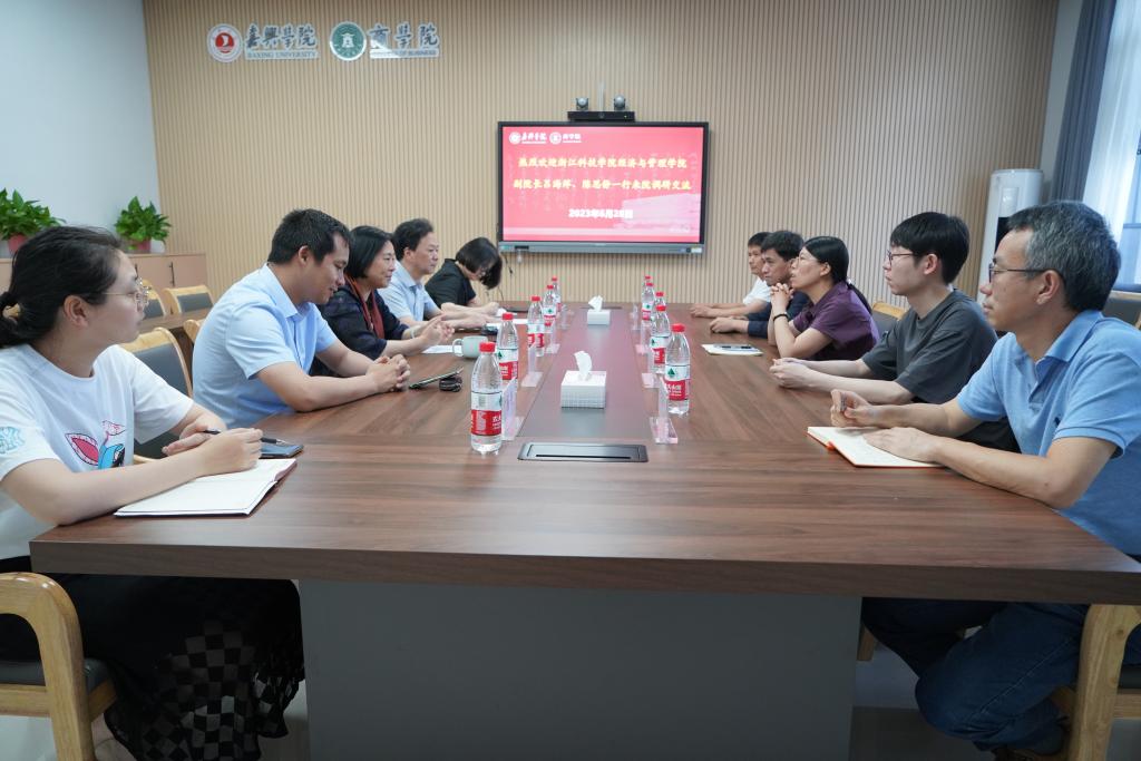 6月28日下午,浙江科技pg麻将胡了2 经济与管理pg麻将胡了2 副院长吕海萍、陈思静一行5人到pg麻将胡了2 调研交流。pg麻将胡了2 院长潘煜双、副院长李郁明、翁胜斌,经管实验中心和院办老师参加交流会谈。