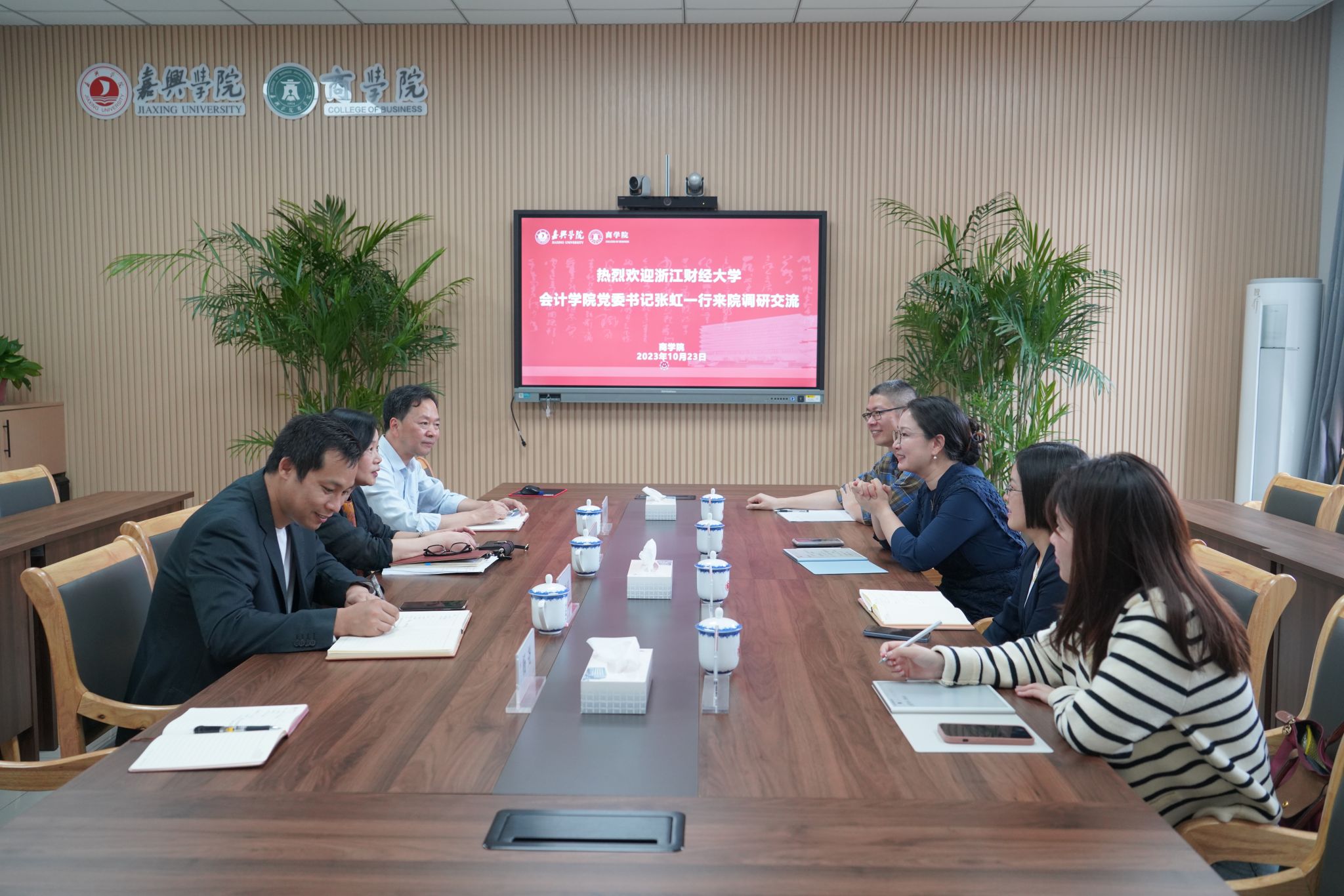 10月23日下午,浙江财经大学会计pg麻将胡了2 党委书记张虹、副院长李文贵、李宗彦一行来院调研交流,院党委书记邵燕、副院长李郁明、翁胜斌参加交流座谈。