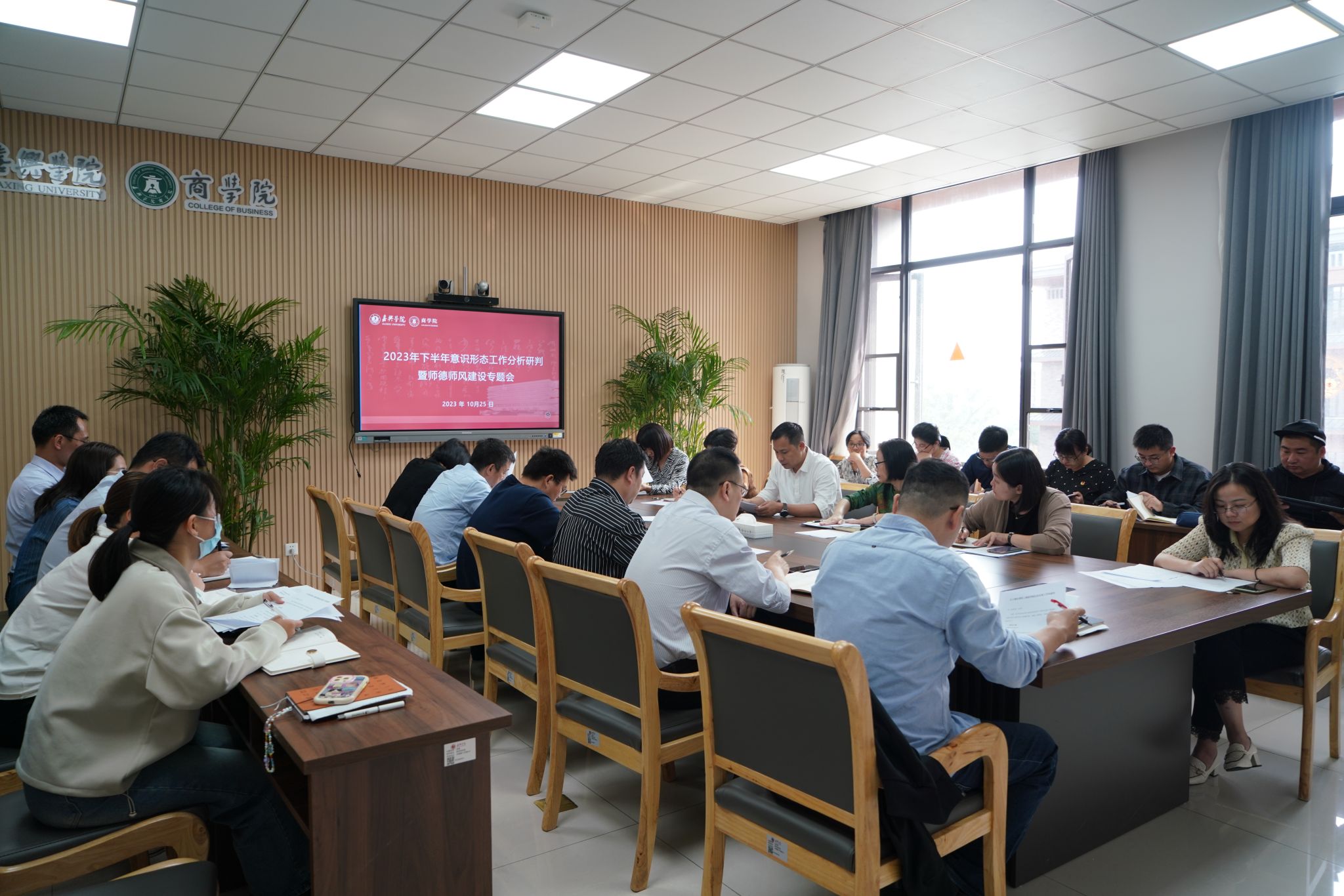 10月25日下午,pg麻将胡了2 党委在尚德楼345会议室召开2023年度下半年意识形态工作分析研判暨师德师风建设专题会议。会议由院党委书记邵燕主持。pg麻将胡了2 党委班子成员、三办主任、系主任、党支部书记和全体辅导员参加会议。