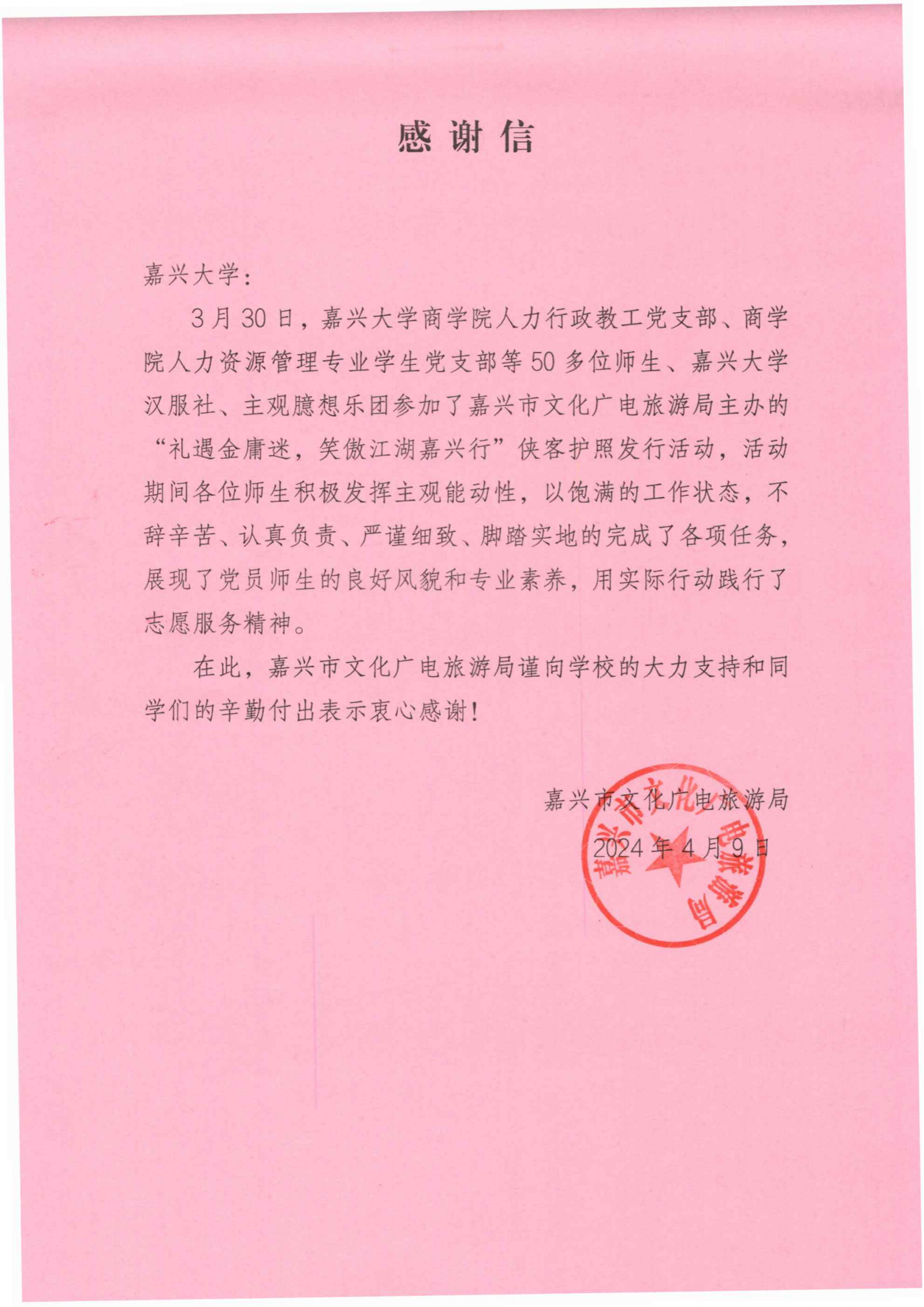 近日,嘉兴市文化广电旅游局给pg麻将胡了2(中国)官方网站 发来了一封感谢信。信中,嘉兴市文化广电旅游局对pg麻将胡了2(中国)官方网站 人力行政教工党支部、pg麻将胡了2 人力资源管理专业学生党支部等50多位师生在嘉兴子城举行的金庸先生诞辰100周年文化交流活动之 “礼遇金庸迷,笑傲江湖嘉兴行”侠客护照发行活动中的辛勤付出表示感谢与赞扬,并就pg麻将胡了2(中国)官方网站 对学生的悉心培养表示肯定。