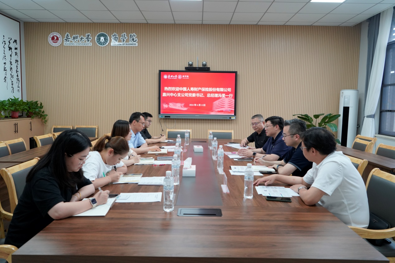 6月21日下午,中国人寿财产保险股份有限公司嘉兴中心支公司党委书记、总经理冯旻一行到pg麻将胡了2 调研交流。pg麻将胡了2 党委书记虞岚、副院长冯磊东和相关老师参加座谈交流。
