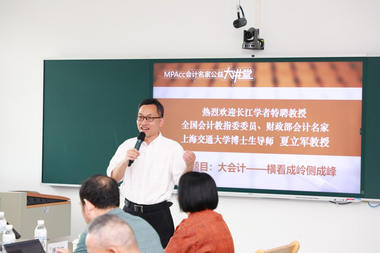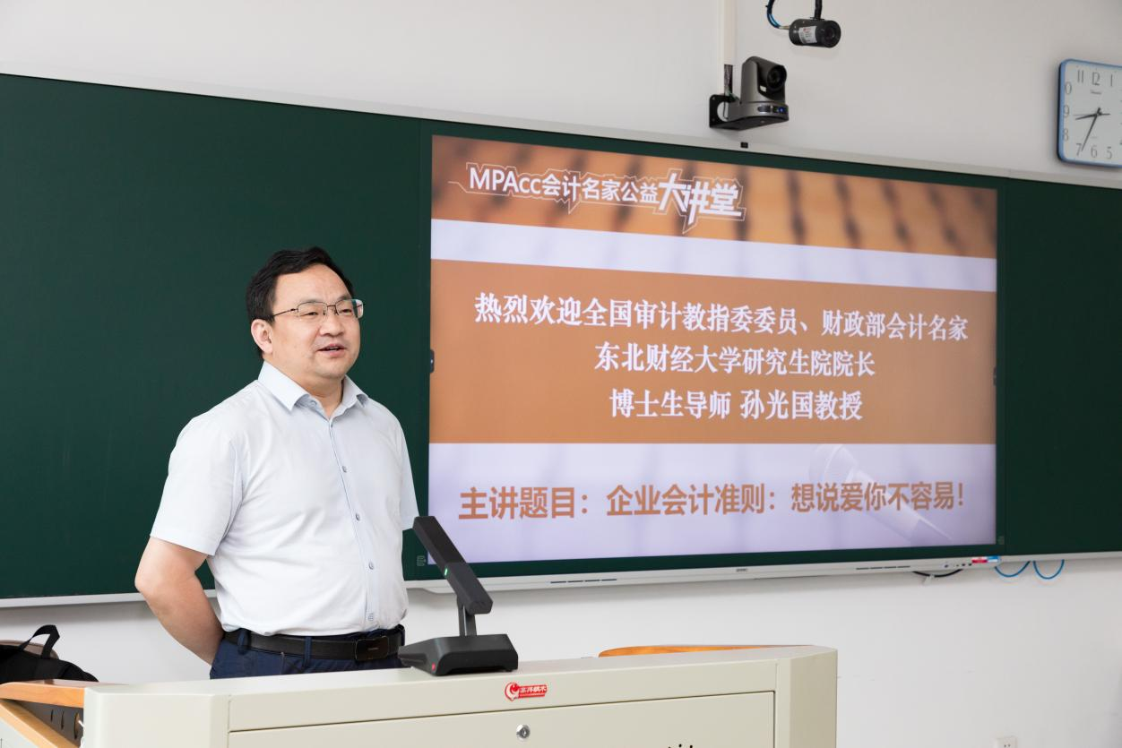 2024年6月28日上午,由中国会计学会、全国会计专业学位研究生教育指导委员会主办,pg麻将胡了2(中国)官方网站 、MPAcc教育中心承办的MPAcc会计名家公益大讲堂在尚德楼311举行,邀请东北财经大学孙光国教授和上海交通大学夏立军教授,就《企业会计准则:想说爱你不容易!》《大会计——横看成岭侧成峰》为主题与广大师生进行分享和交流。讲座由pg麻将胡了2(中国)官方网站 原院长、MPAcc教育中心主任潘煜双教授主持,MPAcc导师和学员共70余人现场聆听这场会计学术盛宴。