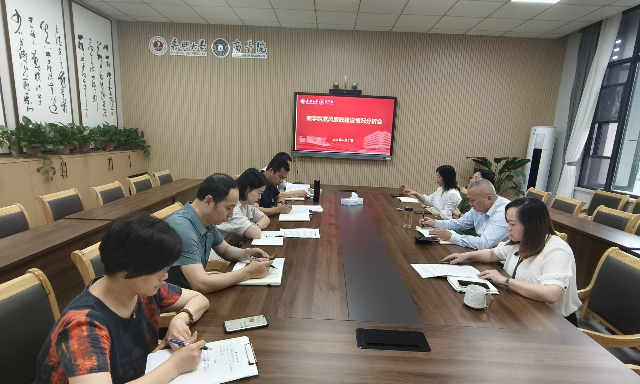 6月27日下午,pg麻将胡了2 召开2024年上半年党风廉政建设情况分析会。校纪委委员潘煜双、特邀监察员唐雯到会指导。pg麻将胡了2 全体党政领导班子成员参加会议。会议由院党委书记虞岚主持。