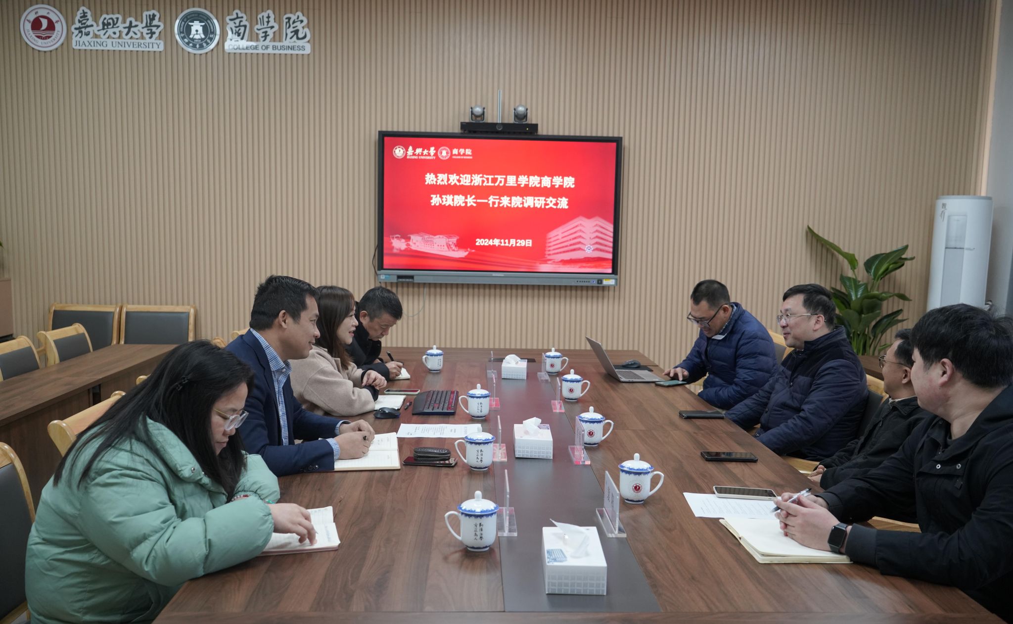 11月29日上午,浙江万里pg麻将胡了2 pg麻将胡了2 执行院长、党委书记孙琪一行到pg麻将胡了2 调研交流。pg麻将胡了2 党委书记虞岚,副院长翁胜斌,会计系主任、MPAcc教育中心执行主任崔晓钟,MPAcc教育中心秘书包翠华参加交流座谈。