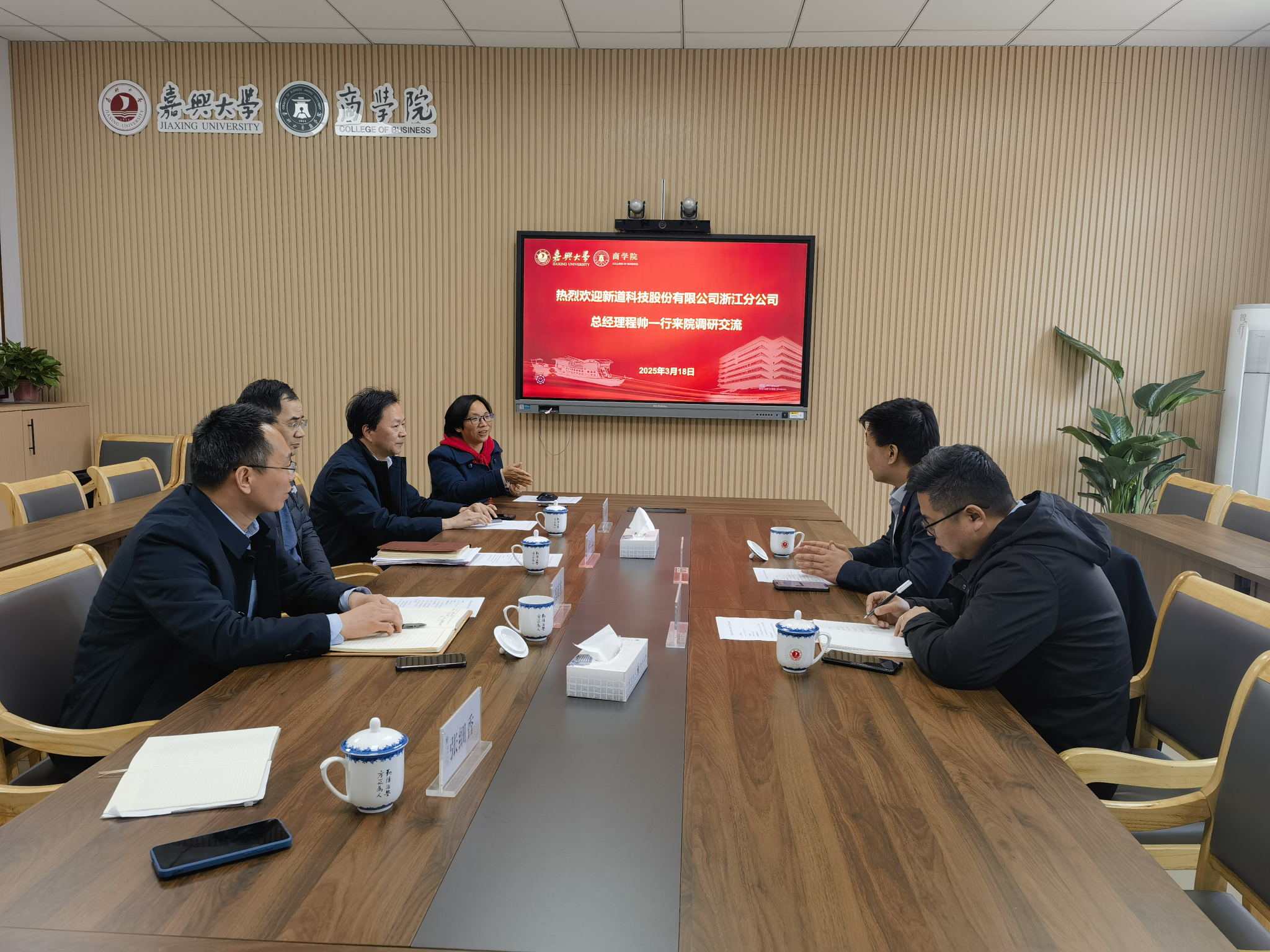 3月18日下午,新道科技股份有限公司浙江分公司总经理程帅、校企合作经理王凯一行来pg麻将胡了2(中国)官方网站 调研交流。校教务处副处长兼创新创业pg麻将胡了2 副院长陈致远、继续教育pg麻将胡了2 副院长李郁明、pg麻将胡了2 副院长冯磊东、沙盘竞赛秘书处办公室主任张细香参加交流座谈。