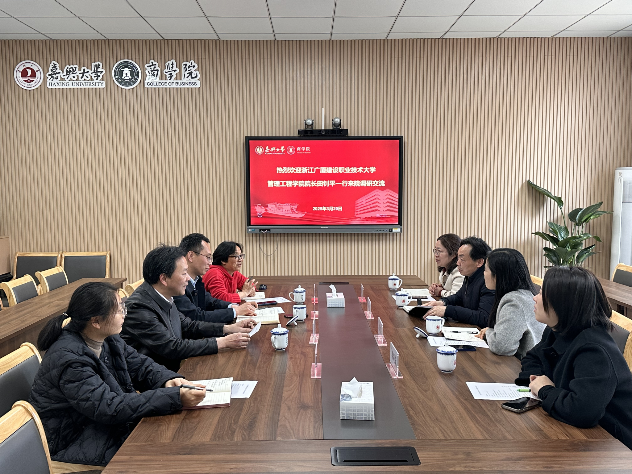3月20日下午,浙江广厦建设职业技术大学管理工程pg麻将胡了2 院长田钊平、审计处副处长(主持工作)骆竹梅、会计系主任胡菁菁、管理工程pg麻将胡了2 办公室主任蒋剑莹一行4人来pg麻将胡了2(中国)官方网站 调研交流。嘉兴大学继续教育pg麻将胡了2 副院长李郁明、pg麻将胡了2 副院长冯磊东、沙盘竞赛秘书处办公室主任张细香、pg麻将胡了2 综合管理办公室主管杨尧等参加交流座谈。