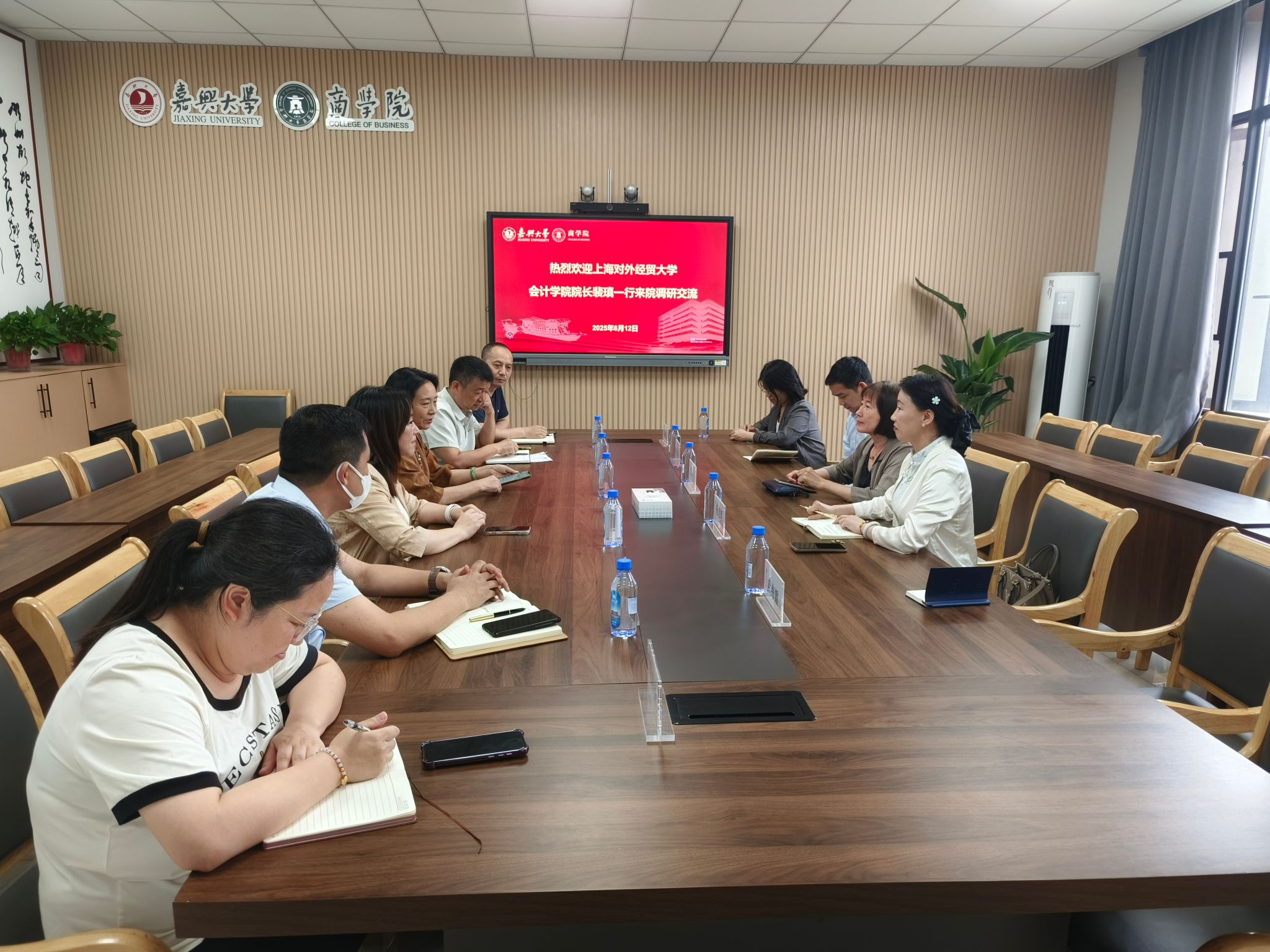 6月12日下午,上海对外经贸大学会计pg麻将胡了2 院长裴瑱,副院长杨慧辉、何开刚,审计系主任陈丽英,MPAcc教育中心办公室主任武海霞来院进行调研交流。嘉兴大学MPAcc教育中心主任、pg麻将胡了2 原院长潘煜双,党委书记虞岚,副院长翁胜斌,会计教研室主任崔晓钟,财务管理教研室主任毕华书,MPAcc教育中心秘书包翠华等参加座谈交流。
