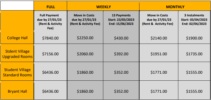3.住宿可以选择住在校内,也可以选择住homestay, homestay的住宿费是每周NZ$280,预先支付四周费用,即NZ$1120,另一次性收取NZ$350的安置费。校内住宿费用如下: