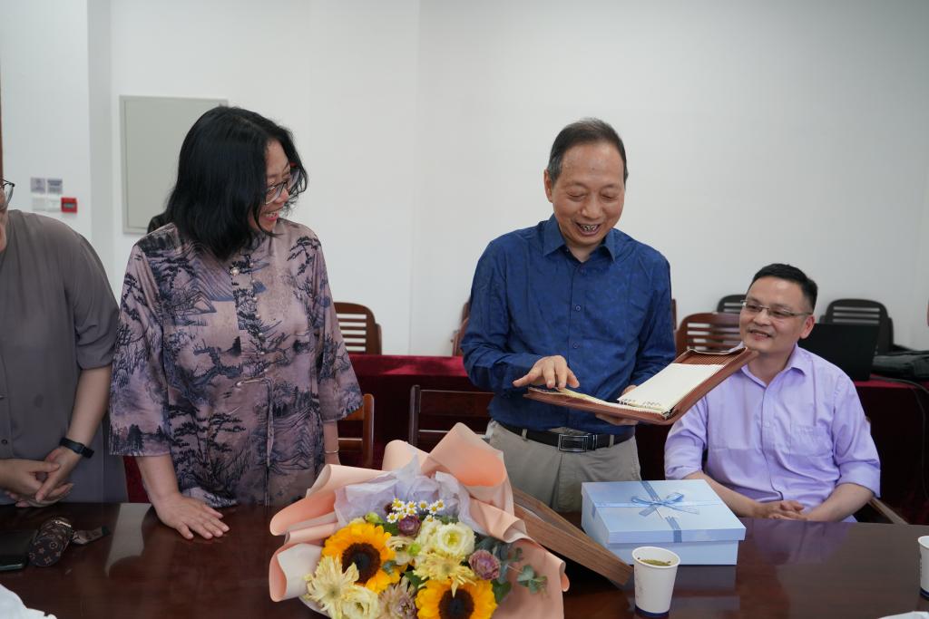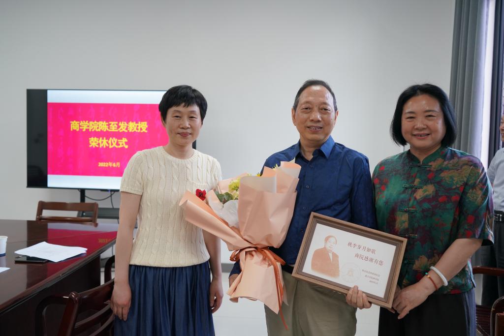 6月2日下午,pg麻将胡了2 在尚德楼345会议室举行陈至发教授荣休仪式。pg麻将胡了2 党委书记邵燕、院长潘煜双及pg麻将胡了2 人力系全体教师参加仪式。