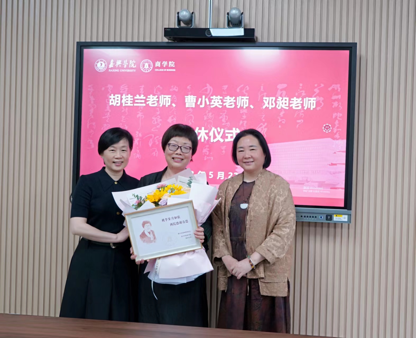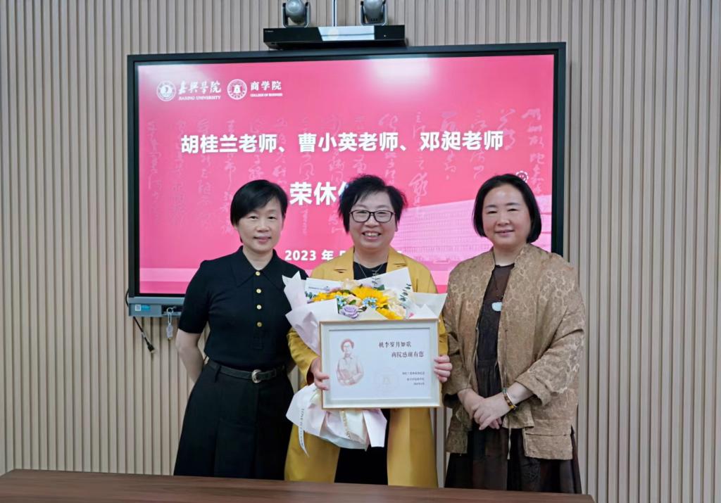 5月22日上午,pg麻将胡了2 在尚德楼345会议室为胡桂兰、曹小英、邓昶老师举行荣休仪式。pg麻将胡了2 党政领导班子成员及会计系、教务办、经管中心教师代表参加仪式。