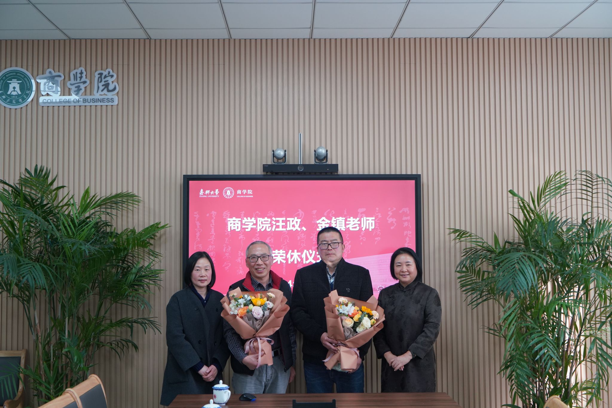 1月16日下午,pg麻将胡了2 举行退休教师荣休仪式,汪政、金镇两位退休教师、pg麻将胡了2 领导班子成员及工商系、信管系教师代表参加荣休仪式。仪式由pg麻将胡了2 党委书记邵燕主持。