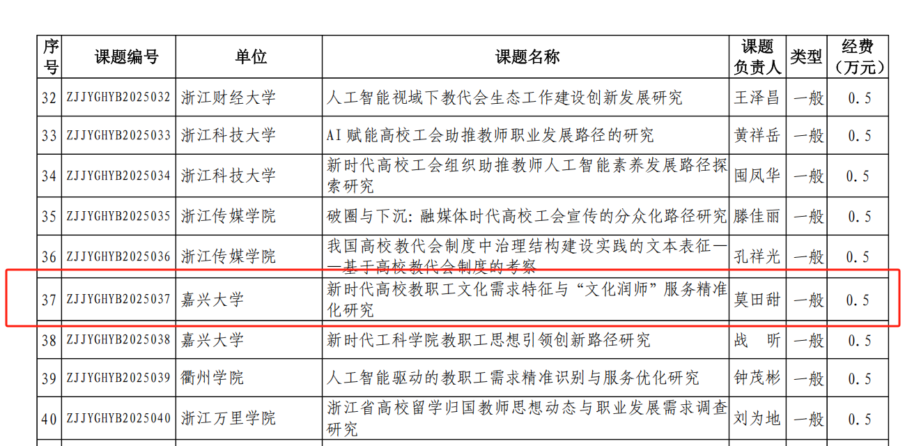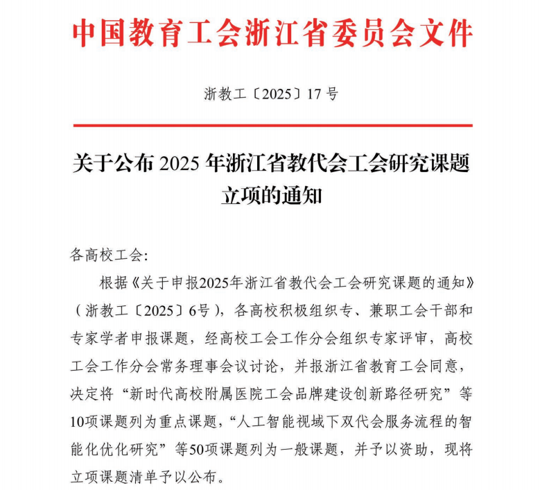 近日,浙江省教育工会公布了2025年浙江省教代会工会研究课题立项名单,pg麻将胡了2(中国)官方网站 莫田甜老师申报的课题《新时代高校教职工文化需求特征与“文化润师”服务精准化研究》成功获批为一般课题。