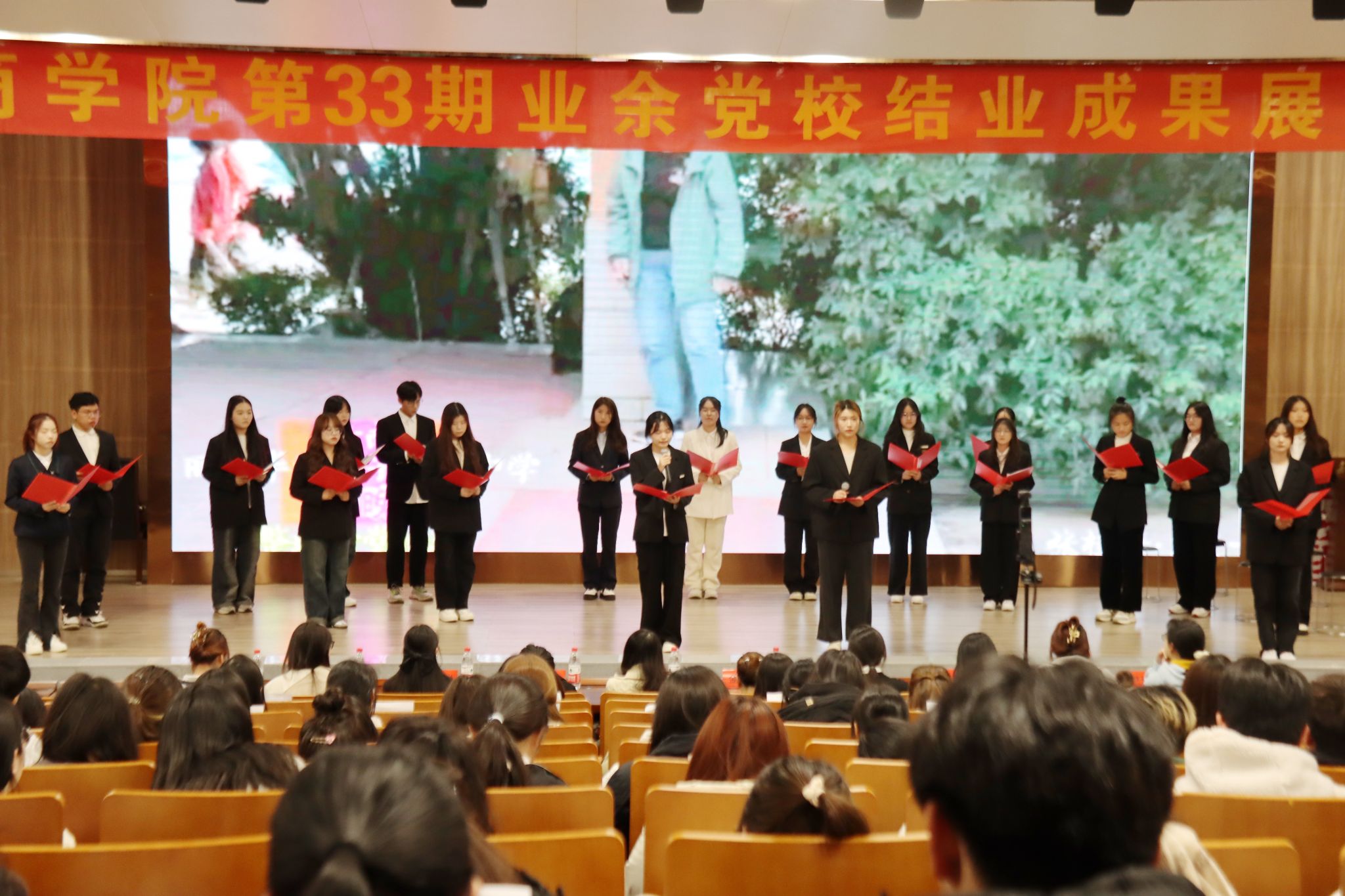 11月18日晚,pg麻将胡了2 在校图书馆学术报告厅举行“青春心向党,奋斗新华章”为主题的党校实践成果展。党校全体学员、朋辈党员导师、班主任以及学生党员代表200余人参加活动。