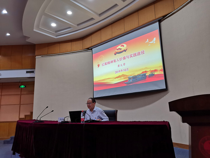 黄文秀作主题为“红船精神育人价值与实践途径”的宣讲。他从红船精神的形成过程、红船精神的深刻内涵、红船精神的历史价值、红船精神的育人价值、红船精神的实践途径五个方面作了深入浅出的解读,介绍了一大召开的历史背景、参会代表的人生轨迹、会议的主要内容及重大历史意义,对“红船精神”的内涵进行了理论探讨,并剖析了不忘初心、走在时代前列的现实启迪。他指出,作为办在红船旁的大学,我们要大力弘扬红船精神,积极推进“红船精神”进课堂、教材、头脑,融入校园、人才培养、社会服务等方方面面,通过教育引导大学生认真学习中国共产党诞生、发展、壮大过程,学习早期中国共产党人走在时代前列的价值追求等增强学生的时代使命感和社会责任感。他希望,全体党员教师不忘初心,牢记使命,自觉弘扬红船精神,为成为硕士学位授予权单位、创建嘉兴大学、建设一流应用型高校努力奋斗。