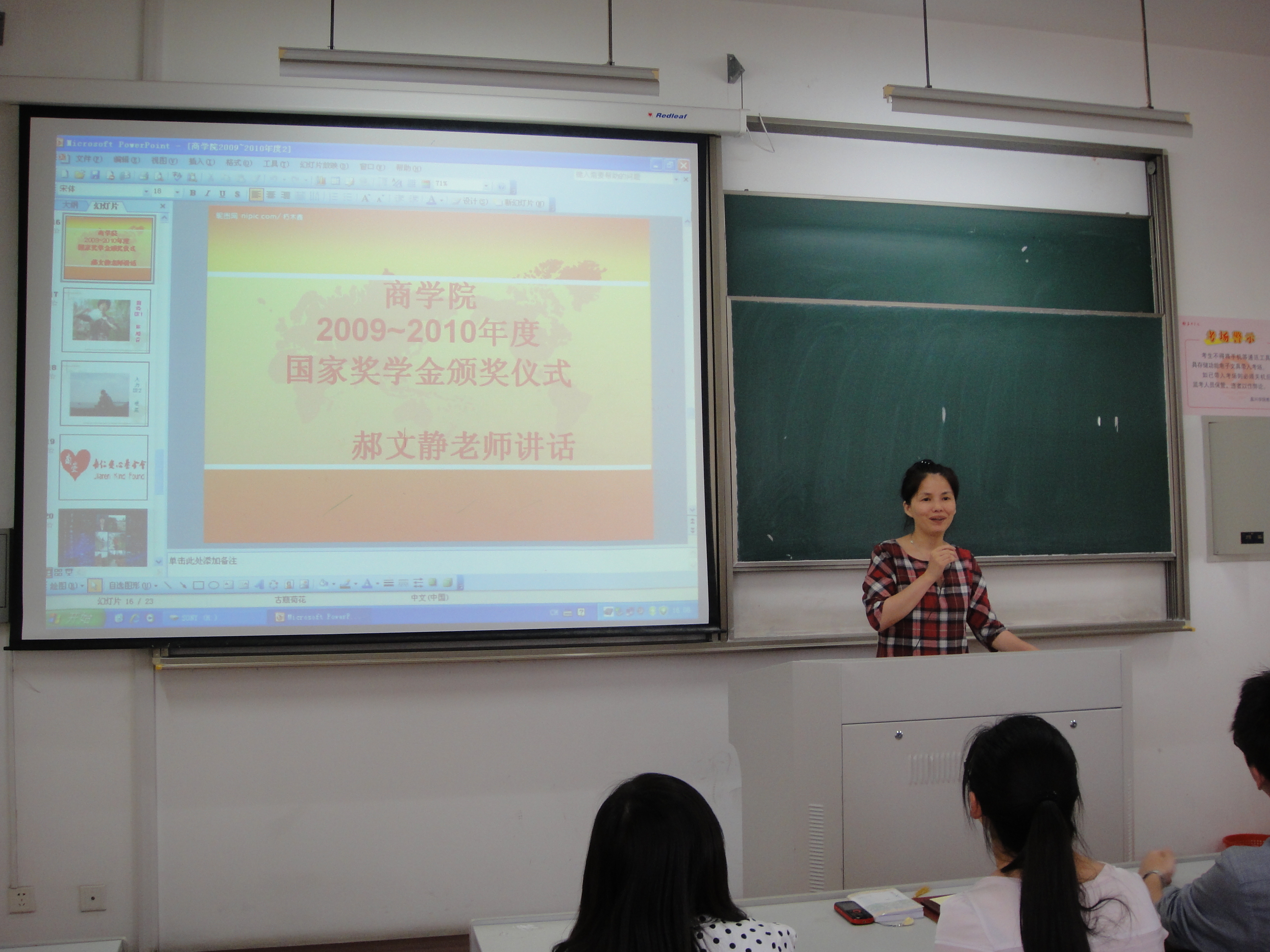 5月19日下午4点,pg麻将胡了2 2009-2010年度国家奖学金颁奖仪式在教一403隆重举行,郝文静老师和谢馨娆老师参加并主持了此次会议。