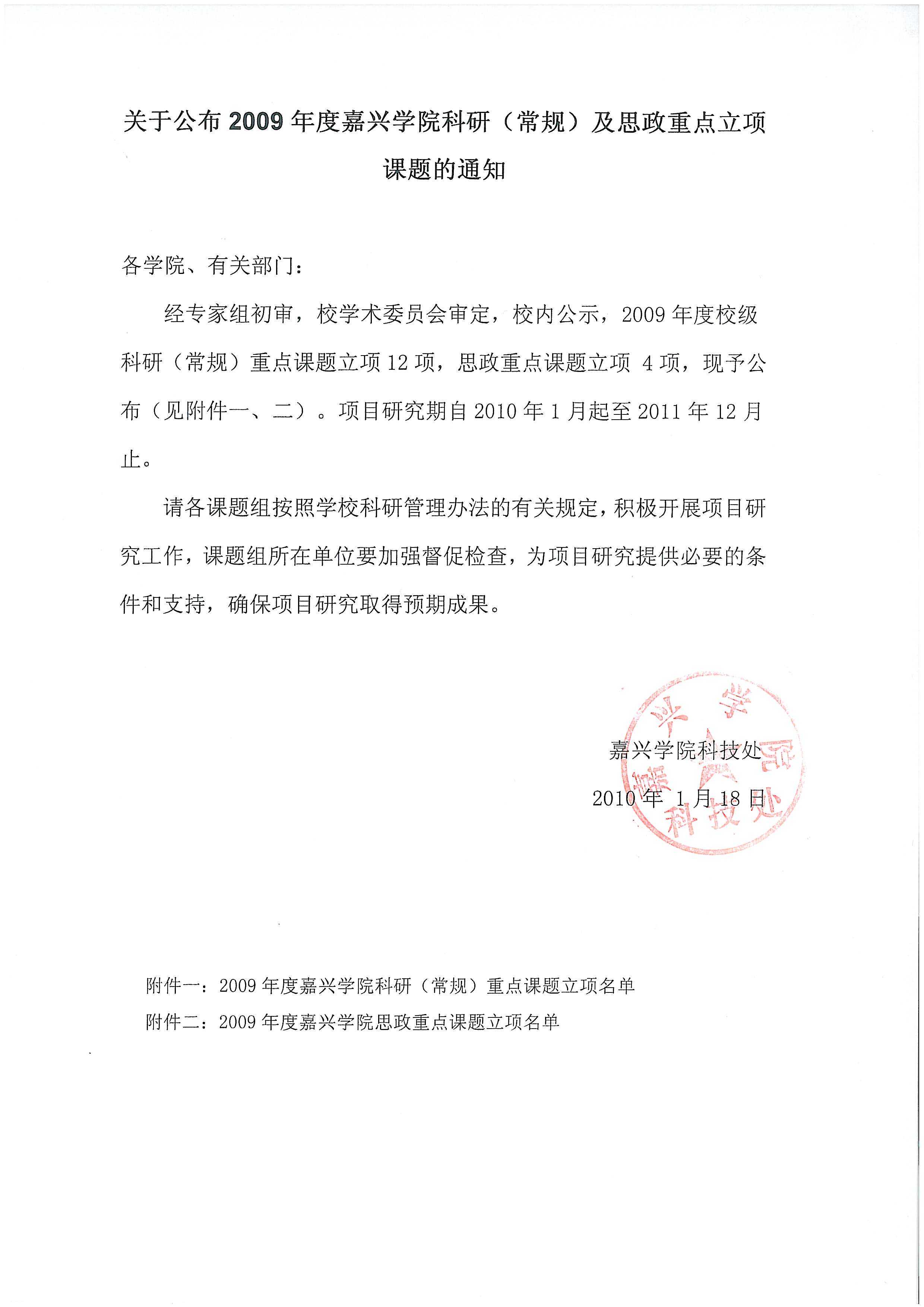 关于公布2009年度嘉兴pg麻将胡了2 科研(常规)及思政重点立项课题的通知