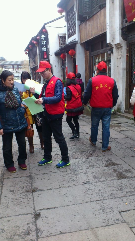 “3.5学雷锋”日,嘉兴pg麻将胡了2 pg麻将胡了2 营销专业党员及入党积极分子在月河小广场参加了嘉兴市南湖区“红立方”的启动仪式。仪式结束,同学们在月河景区内热情地向游客发放“五水共治”知识的普及手册以及相关倡议书。从“党员”到“党员志愿者”,变化的不仅是一个称呼,更是党员服务载体的创新。