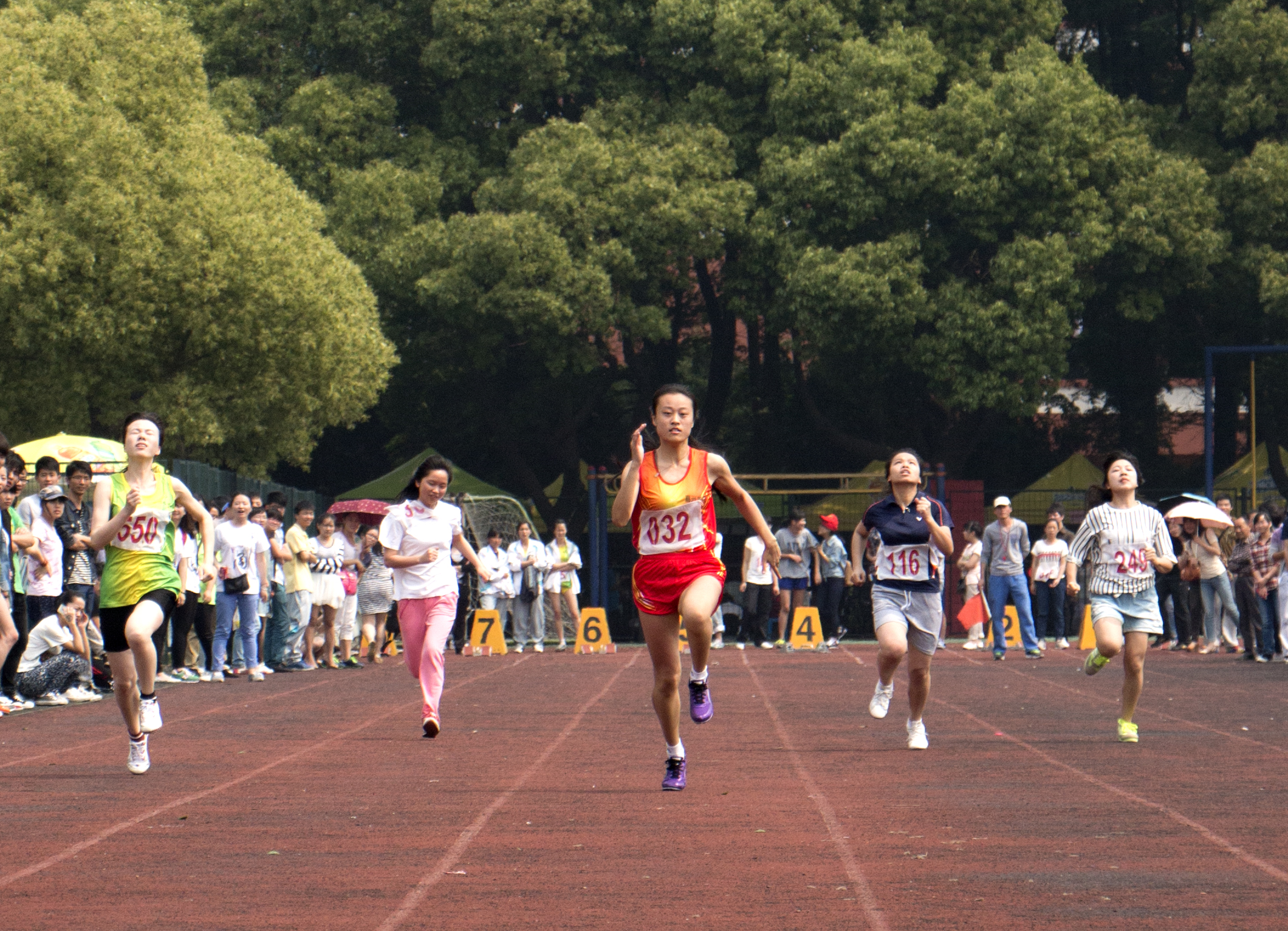 赛前,运动员们个个神情饱满,摩肩擦掌。在裁判的指令下,在跑道前摆好姿势,蓄势待发。“砰”的一声枪响,起跑线像一条绷紧了的弓弦,瞬间发出八支“彩色的箭”,运动员们矫健的身姿夹杂着观众热烈的呐喊贯穿了整个赛场。