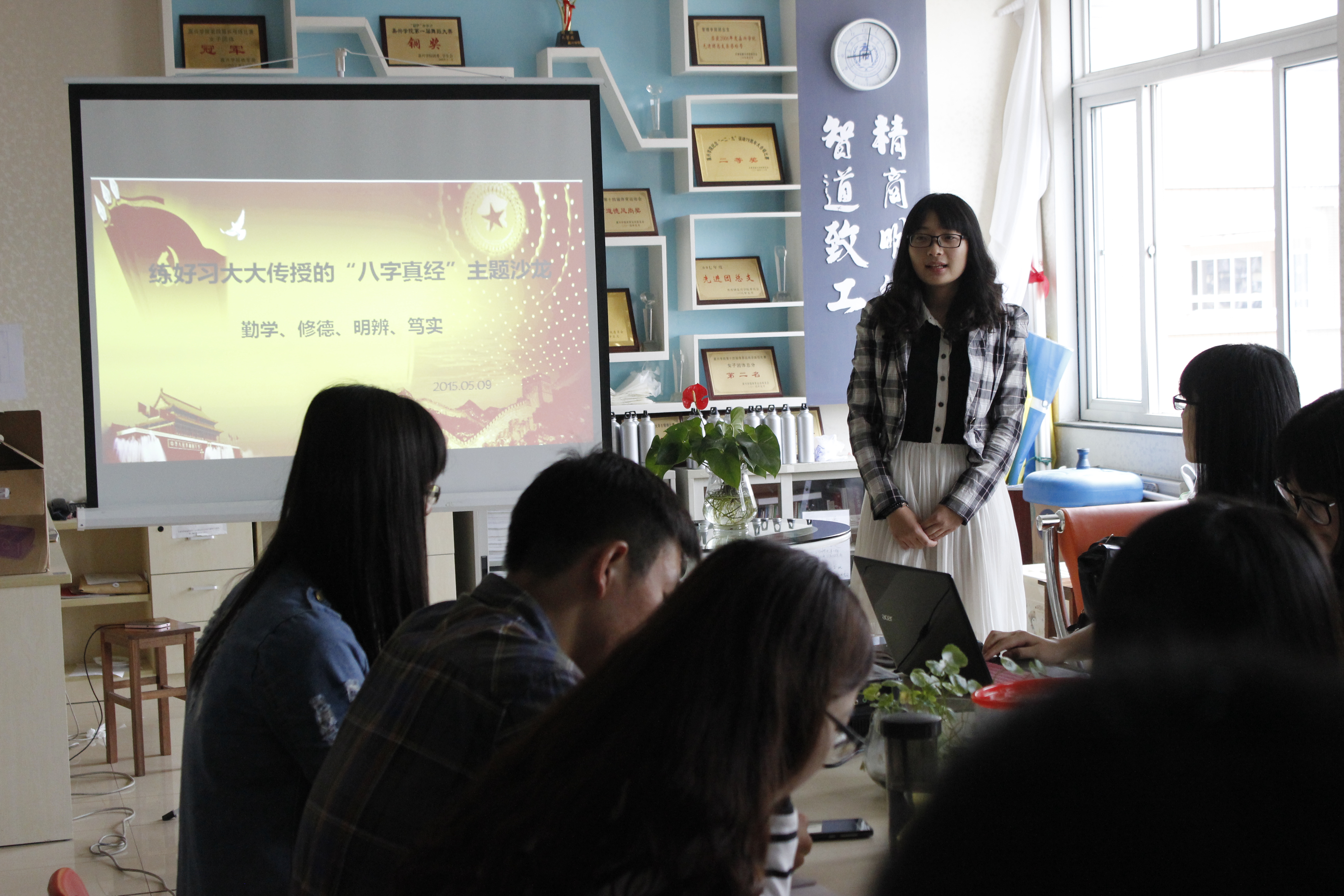 5月9日上午,pg麻将胡了2 团委在教一427举办了pg麻将胡了2 学习“八字真经”主题沙龙活动。出席主题沙龙的有pg麻将胡了2 团委副书记阮鋆燕、办公室主任刘俊、青协副会长杨莹莹、以及来自五个班级团支部的18位学习代表。
