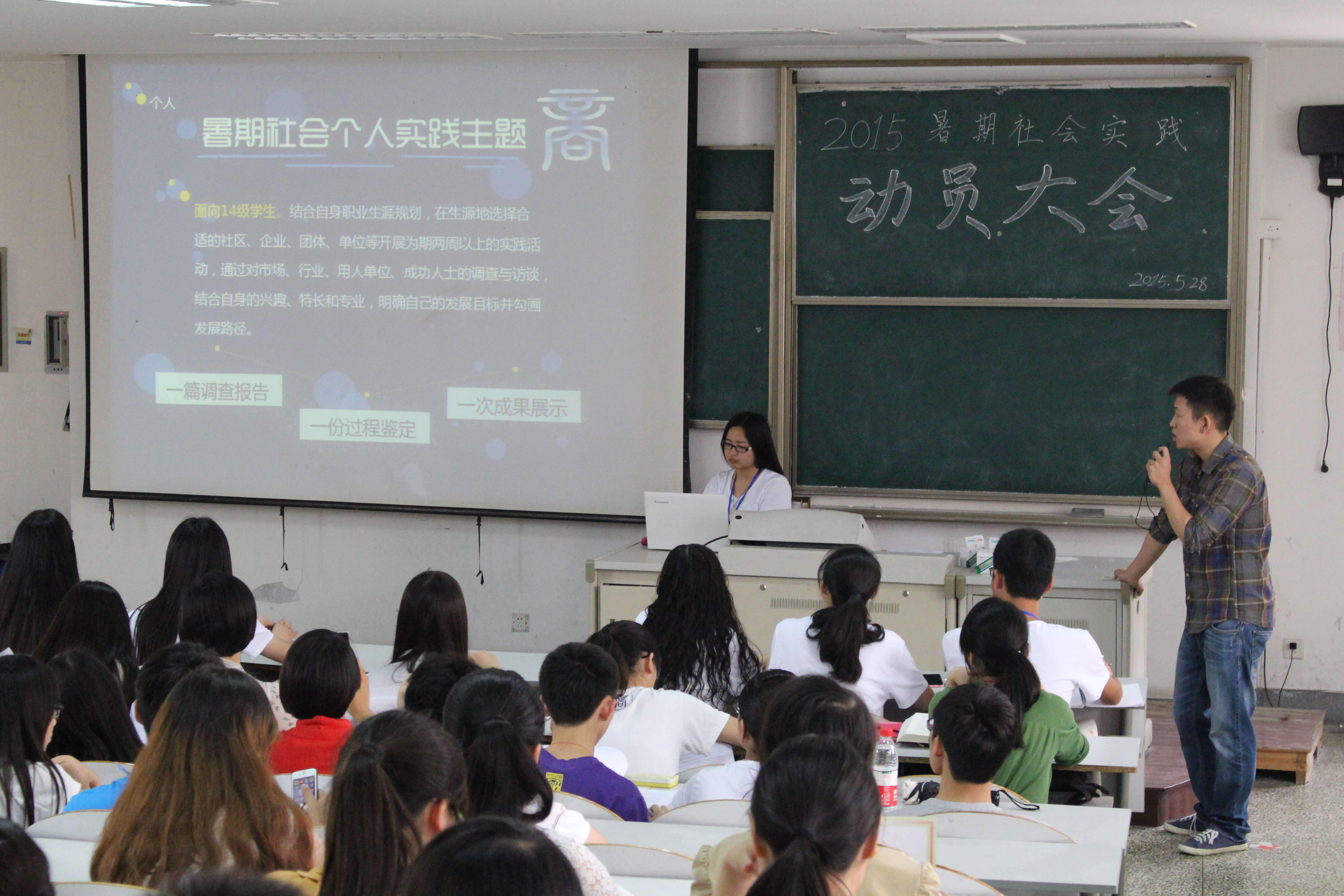 5月28日中午,pg麻将胡了2 在教一259举行了2015年暑期社会实践动员大会。会议由团委办公室主任刘俊同学主持,pg麻将胡了2 团委书记潘欣老师、团学成员、班团支书和部分实践意向同学参加了会议。