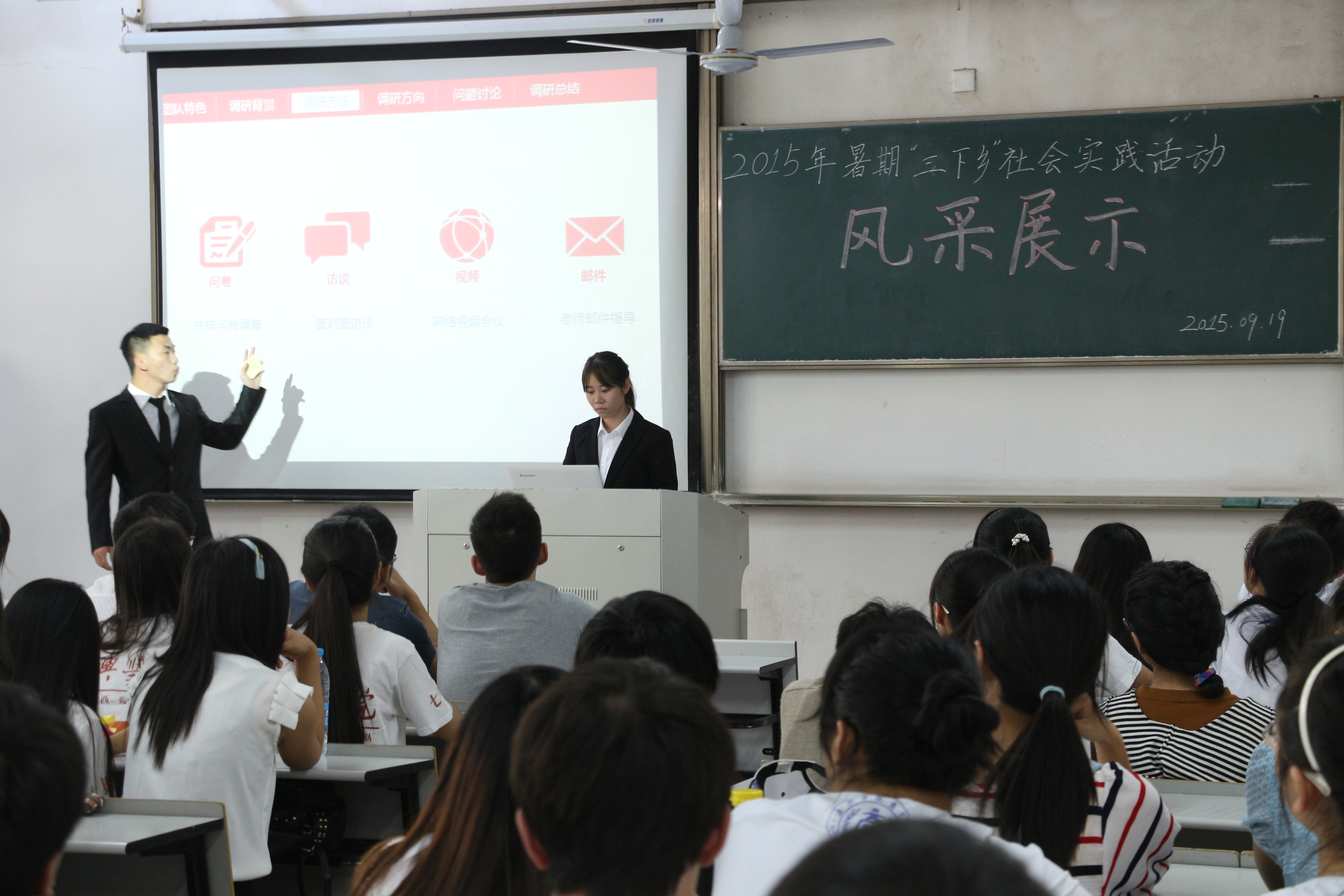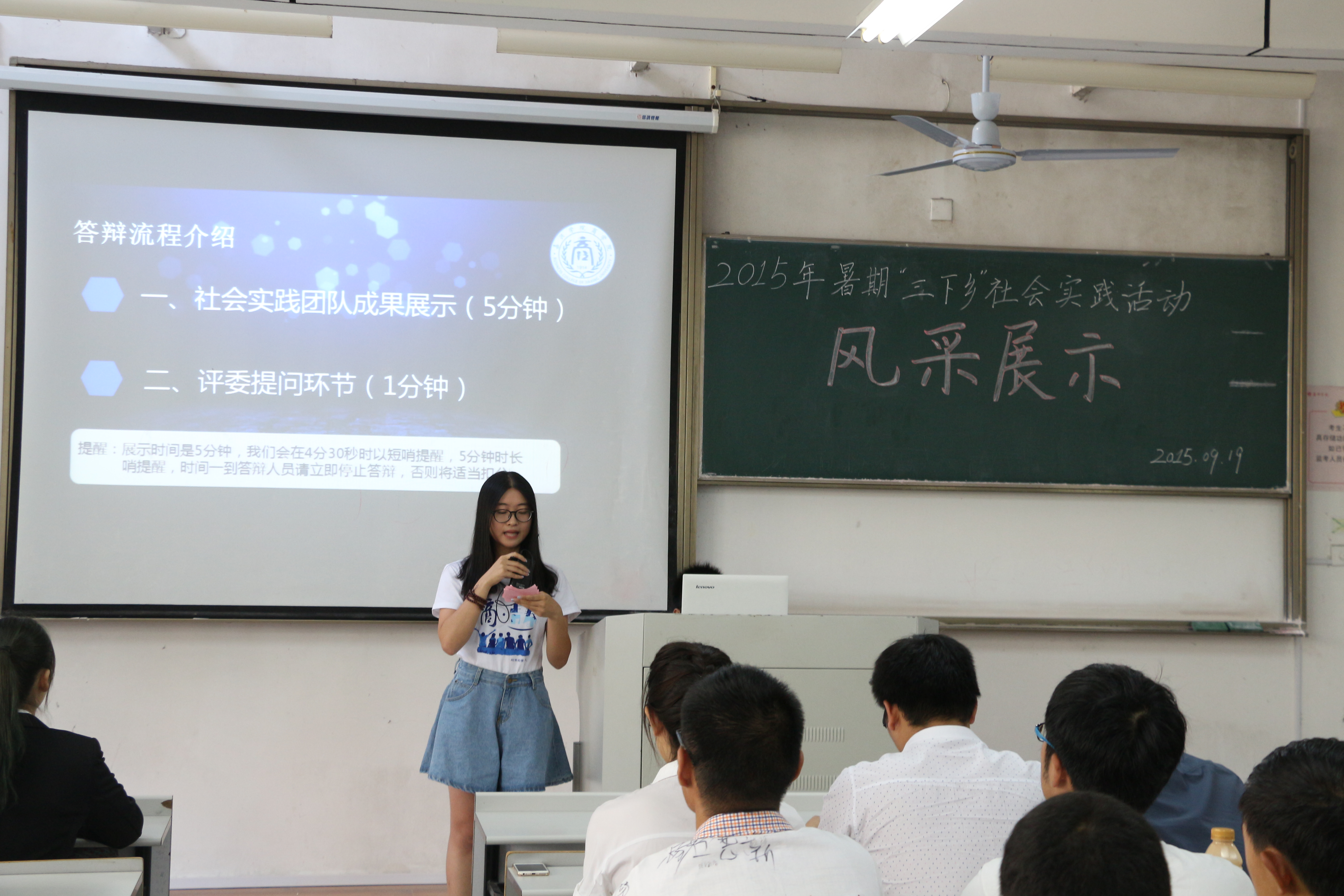 9月19日下午,pg麻将胡了2 2015年暑期“三下乡”社会实践风采展示在教二B106如期开展。pg麻将胡了2 团委李朋朋老师、左飞龙老师、团委副书记阮鋆燕、团委办公室主任刘俊担任评委。