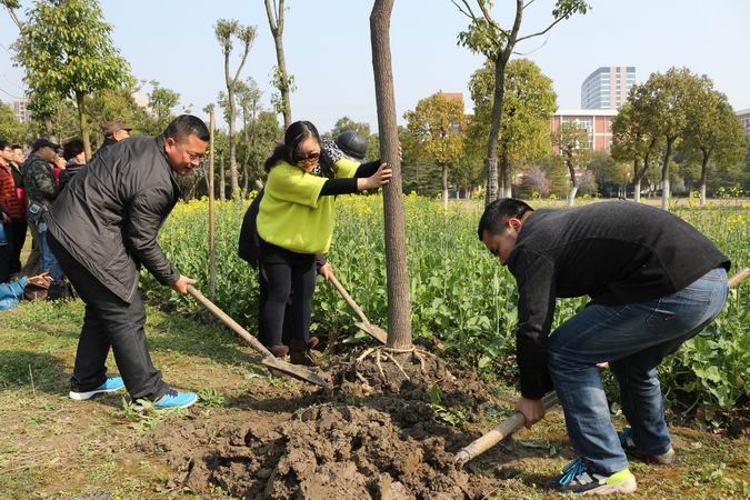 早上八点半,报名参加活动的同学陆续来到指定地点集合,然后步行前往梁林校区。虽然严冬的北风还未偃旗息鼓,初春的阳光也还显得姗姗来迟,但这些都未影响同学们的情绪,大家就这样一路欢笑地来到了植树地点——校友林。现场分配好任务后,大家干劲十足,老师和同学一起拿起铁锹,相互协作,种下七棵香樟树。在植树过程中,来自后勤公司的师傅给大家做了技术指导,让同学们学习到植树的基本程序和关键细节。