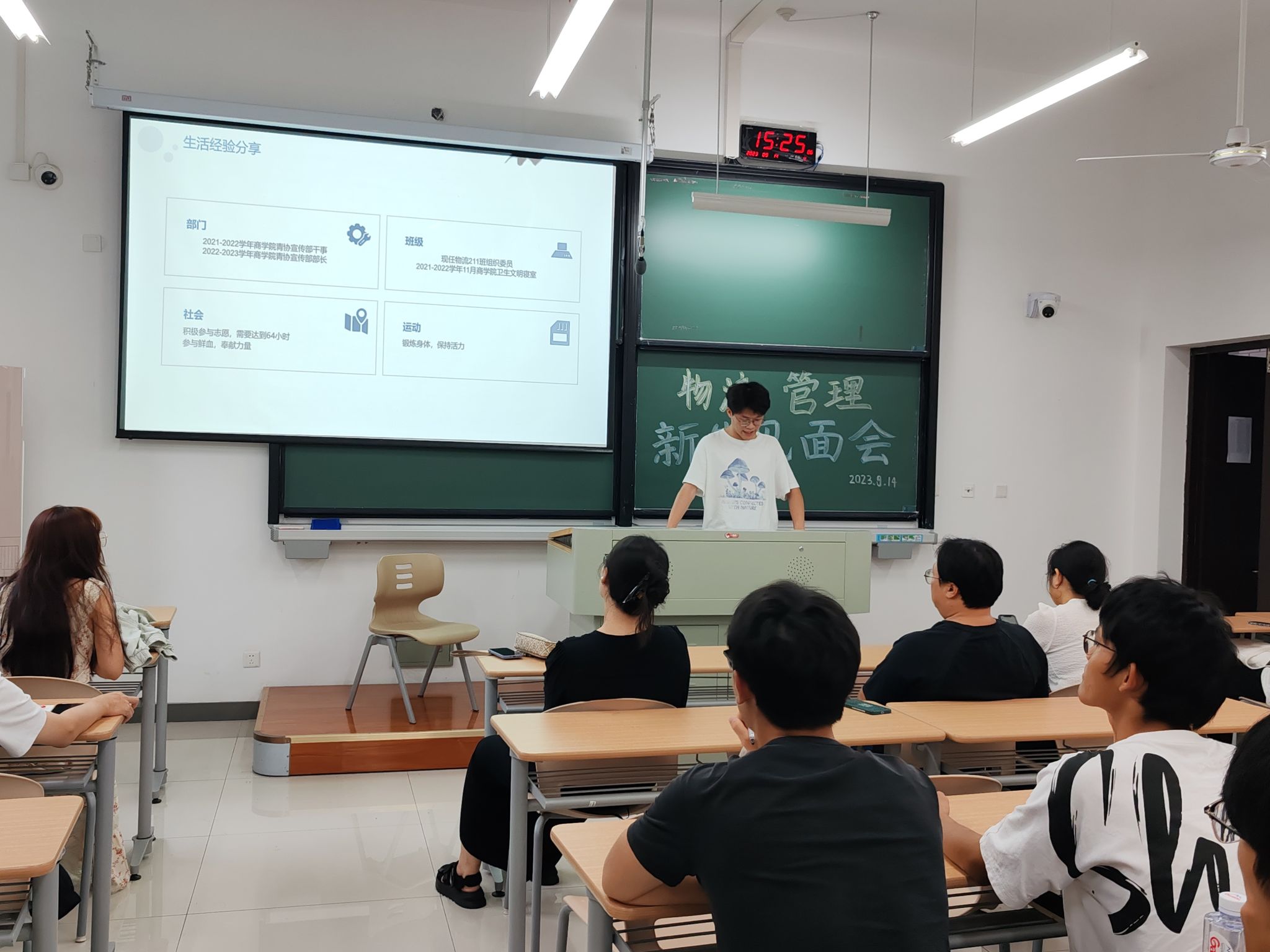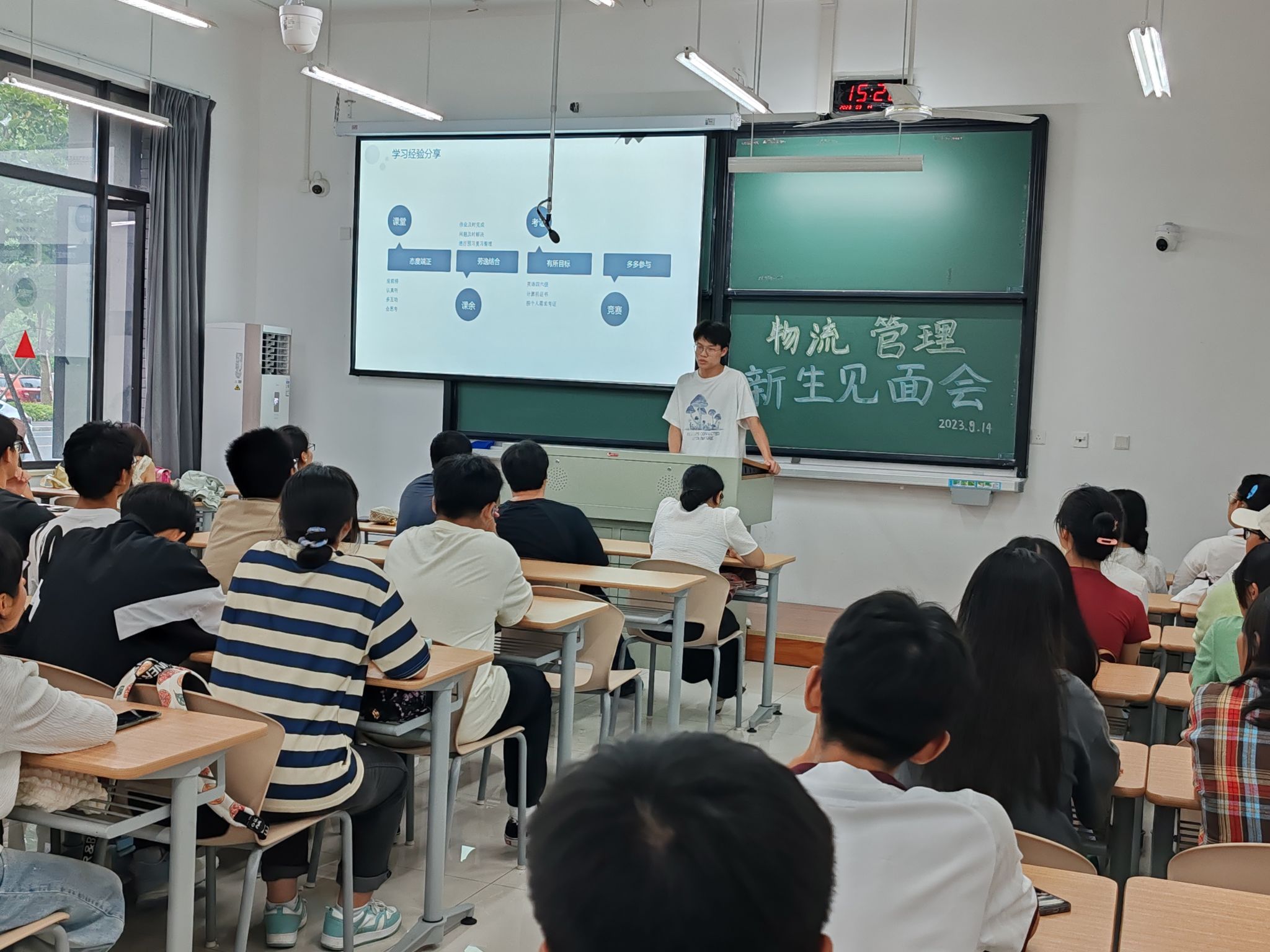 物流管理211班组织委员、预备党员、优秀学长代表盛云飞为23级新生分享大学学习及生活经验。他希望学弟学妹牢牢把握课堂珍贵的学习时间,同时课余时间要懂得劳逸结合,积极参加专业竞赛、考取证书等可以增长才干、丰富经验的事情。让大学生活能有新发展、新创造、新境界,一切向新而行。