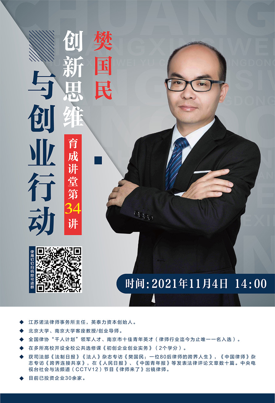 114日下午,江苏诺法律师事务所主任、英泰力资本创始人,北京大学、南京大学客座教授、创业导师樊国民应邀作客育成讲堂第34讲,为近500名师生作题为“创新思维与创业行动”的云讲座。此次云讲座由创业pg麻将胡了2 主办、pg麻将胡了2 承办。