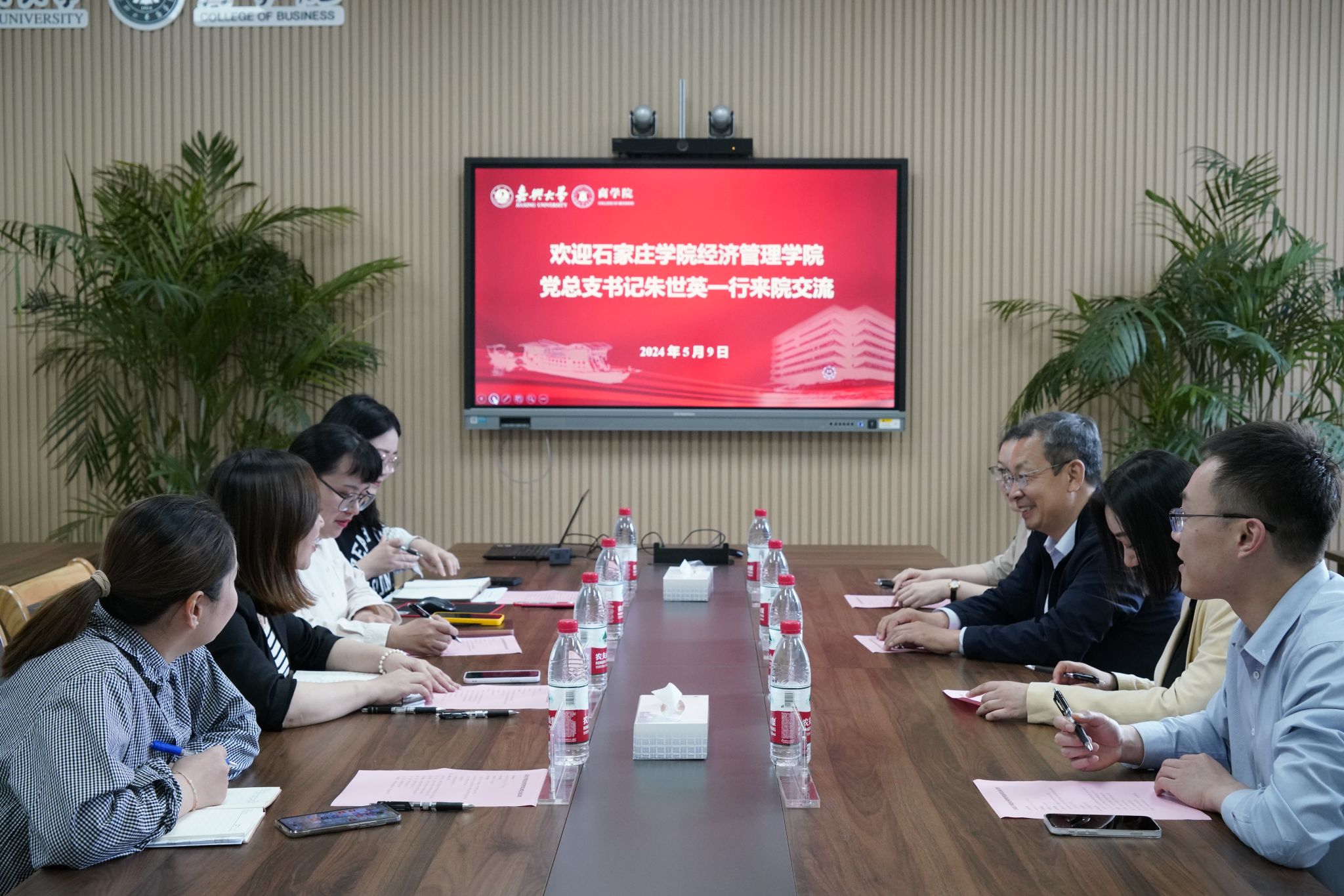 5月9日上午,石家庄pg麻将胡了2 经济管理pg麻将胡了2 党总支书记朱世英一行4人到pg麻将胡了2 调研交流。院党委书记虞岚、党支部书记代表参加交流座谈。