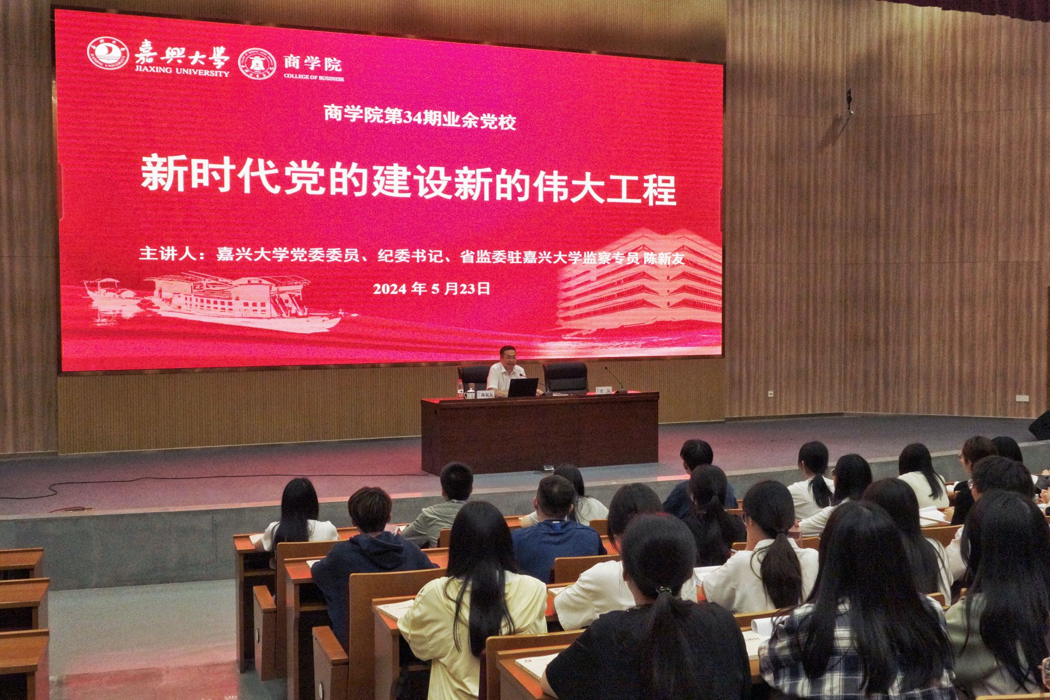 5月23日,嘉兴大学党委委员、纪委书记、省监委驻嘉兴大学监察专员陈新友应邀为pg麻将胡了2 第34期业余党校讲授题为《新时代党的建设新的伟大工程》的专题党课。党校全体学员参加党课。
