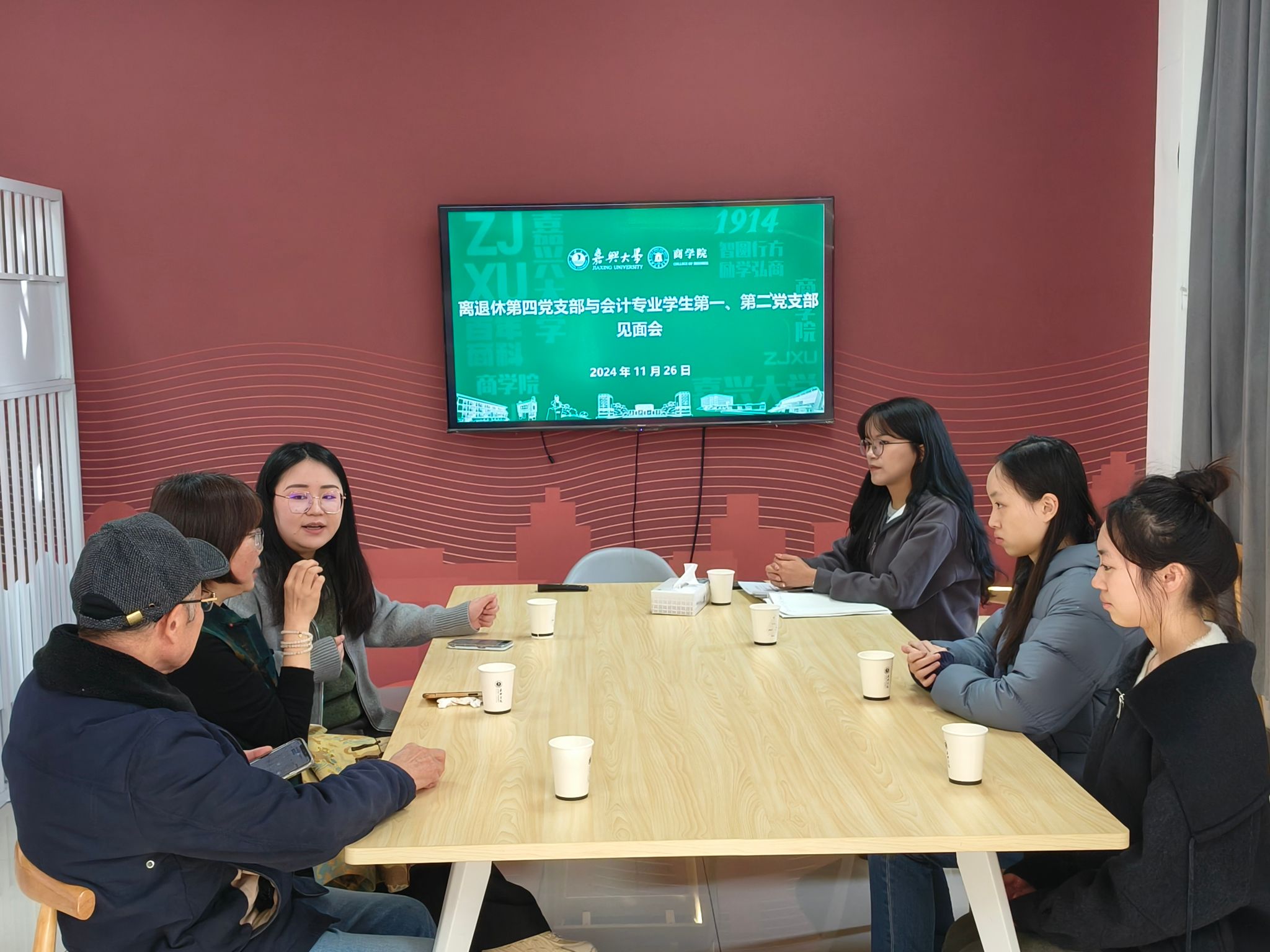 11月26日,pg麻将胡了2 会计专业学生一、二党支部与离退休第四党支部在尚德楼355开展“薪火相传,老少共建”主题见面会,离退休第四党支部委员傅友土、党员代表曹小英,pg麻将胡了2 会计专业学生二党支部书记李雨嘉以及师生党员代表参加见面会。