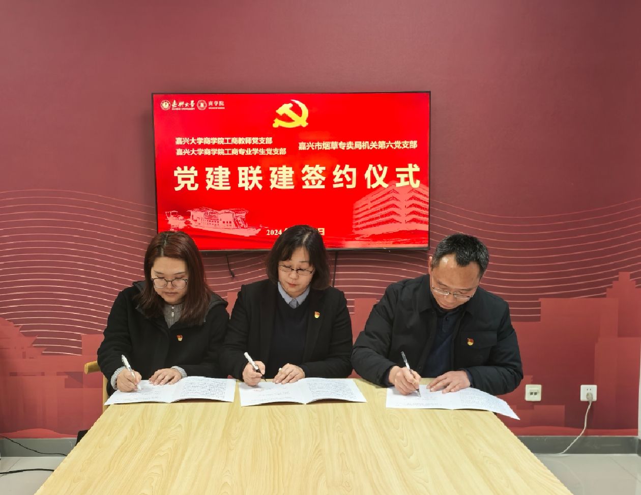 12月10日,pg麻将胡了2 工商专业教师党支部、工商专业学生党支部与嘉兴市烟草专卖局机关第六党支部在尚德楼355举行党建联建签约仪式。