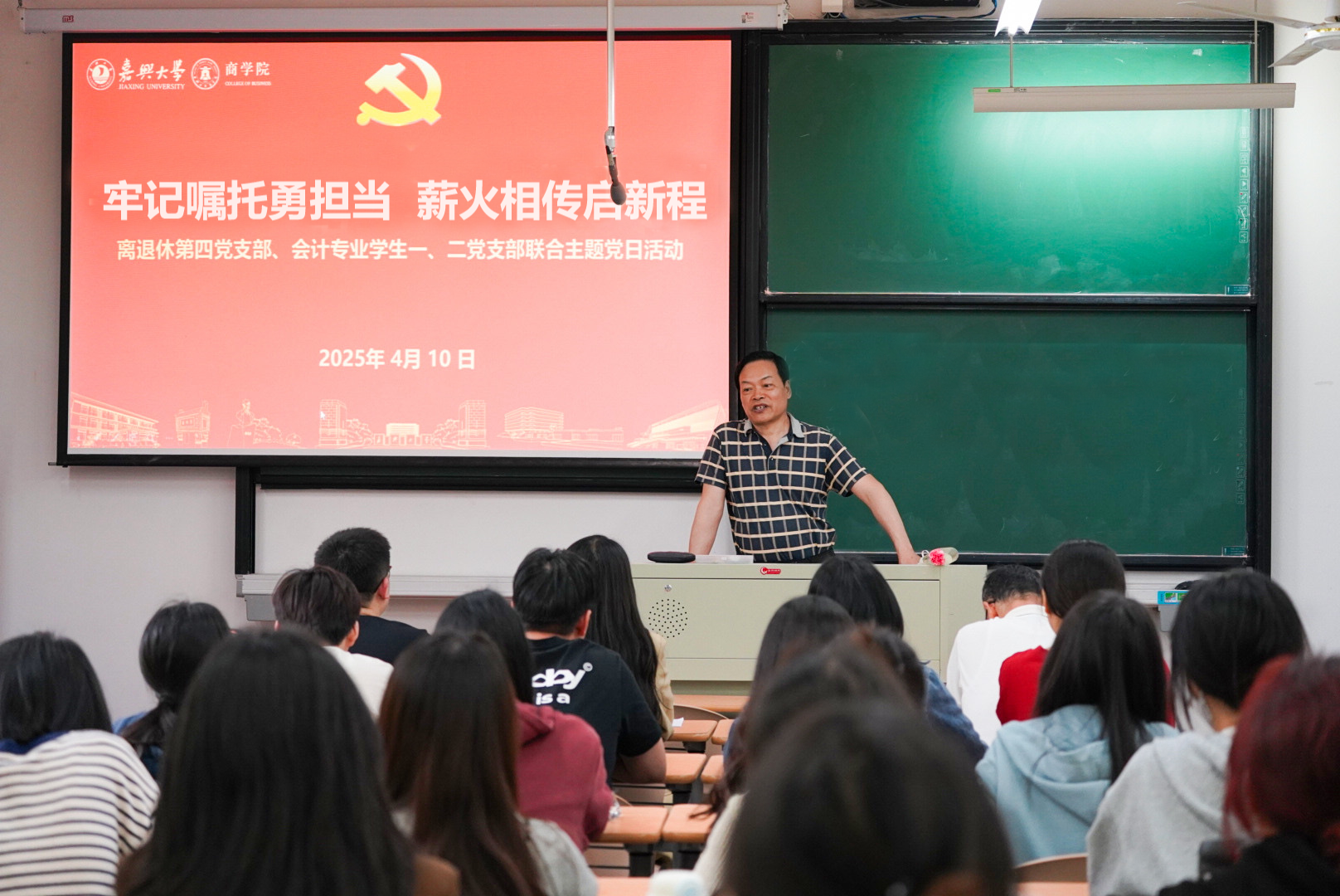 4月10日下午,pg麻将胡了2 会计专业学生第一、二党支部与离退休第四党支部以“牢记嘱托勇担当, 薪火相传启新程”为主题开展联合党日活动,师生党员30余人参加活动。